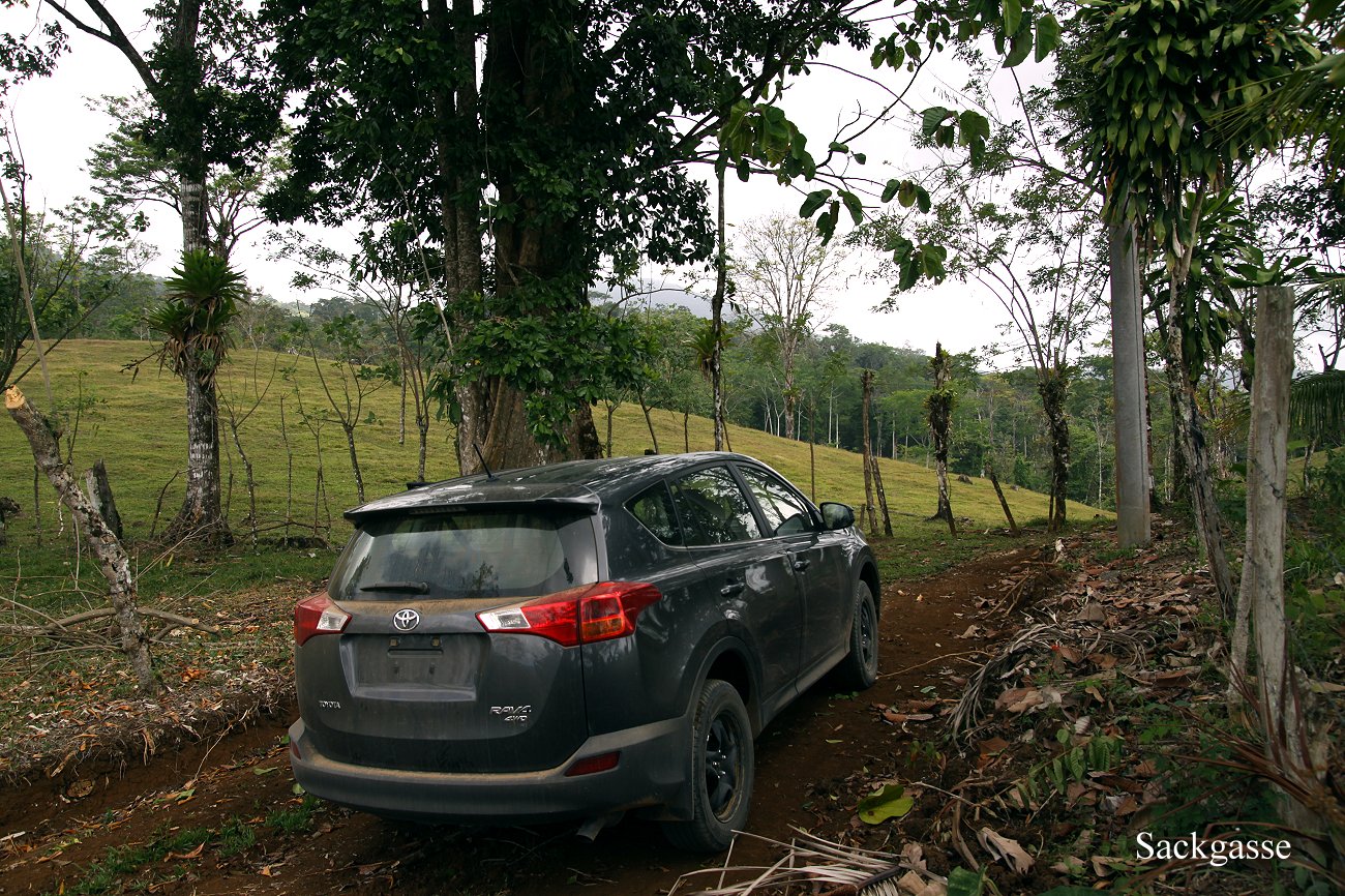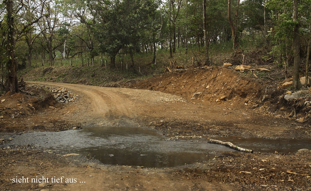 Heute wollten wir zum Nationalpark Rincon de la Vieja fahren. Pablo gab uns eine selbsterstellte Karte der Umgebung und erklärte uns die einzelnen Straßen und Wege. Da es ziemlich trocken war, empfahl er uns einen ca. 15 km langen Weg durch den dichten Urwald zum Nationalpark zu fahren. Wir fuhren gegen 9:00 h los. Nach 7 km sollte eine kleine Abzweigung kommen. Zunächst bogen wir falsch ab und landeten nach etwa 1 km an einem Weidezaun, wo es nicht mehr weiter ging. Ich wendete auf engstem Raum und als wir den Hauptweg erreicht hatten, fanden wir auch schnell die richtige Abzweigung. Durch dichten Wald ging es über eine äußerst holprige Piste auf und ab. Wir mussten einige ganz schmale Brücken ohne seitliche Begrenzung passieren, sowie einige Bäche durchqueren, deren Bett allerdings nicht sehr tief war. |