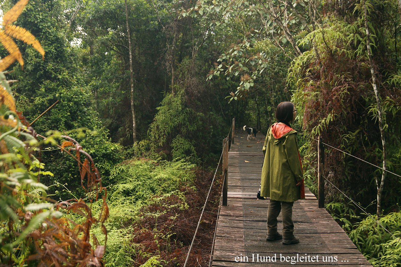 Um 5:30 h wurden wir wach. In der Nacht blieb es trocken und als wir aus dem Fenster schauten, sah das Wetter ganz passabel aus. Also blieben wir nicht lange liegen, sondern nahmen Fernglas und Fotoapparat in die Hand und machten gegen 6:00 h einen kleinen Spaziergang, diesmal in Richtung des Trails, den wir gestern bei der Führung genommen hatten. Einer der Hunde Pablos folgte uns. Wir befürchteten schon, dass der Hund wohl alle Vögel vertreiben würde. Das war aber nicht der Fall , im Gegenteil, der Hund trottete brav mit uns daher und ließ sich von Tomoko und mir immer wieder streicheln. |