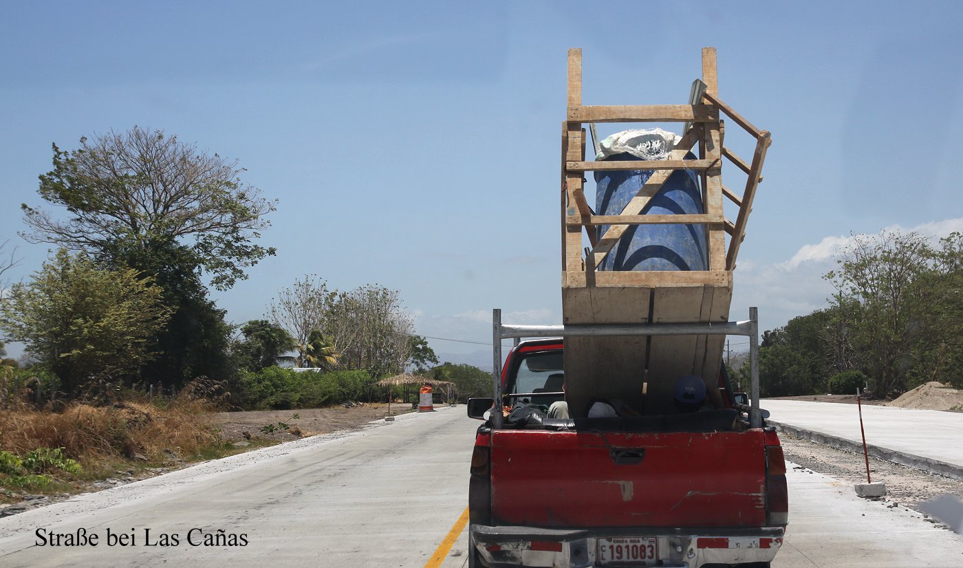 Es war inzwischen heiß geworden. Gegen 11.00 h erreichten wir Guayabo. Es herrschte sehr wenig Verkehr. Die Landschaft Guanacaste, durch die wir gerade fuhren, ist ziemlich dürr und trocken, ganz anders als die Gebiete, die wir bisher durchfahren hatten. Einige blühende Bäume säumten die Straßen. In dem kleinen Örtchen Bagaces trafen wir auf die Interamericana, die Nationalstraße Nr.1, auf der wir bis zur nächsten größeren Stadt Las Cañas fuhren. Hier wird die Straße erweitert, was eine ziemlich lange staubige Baustelle zur Folge hatte. |