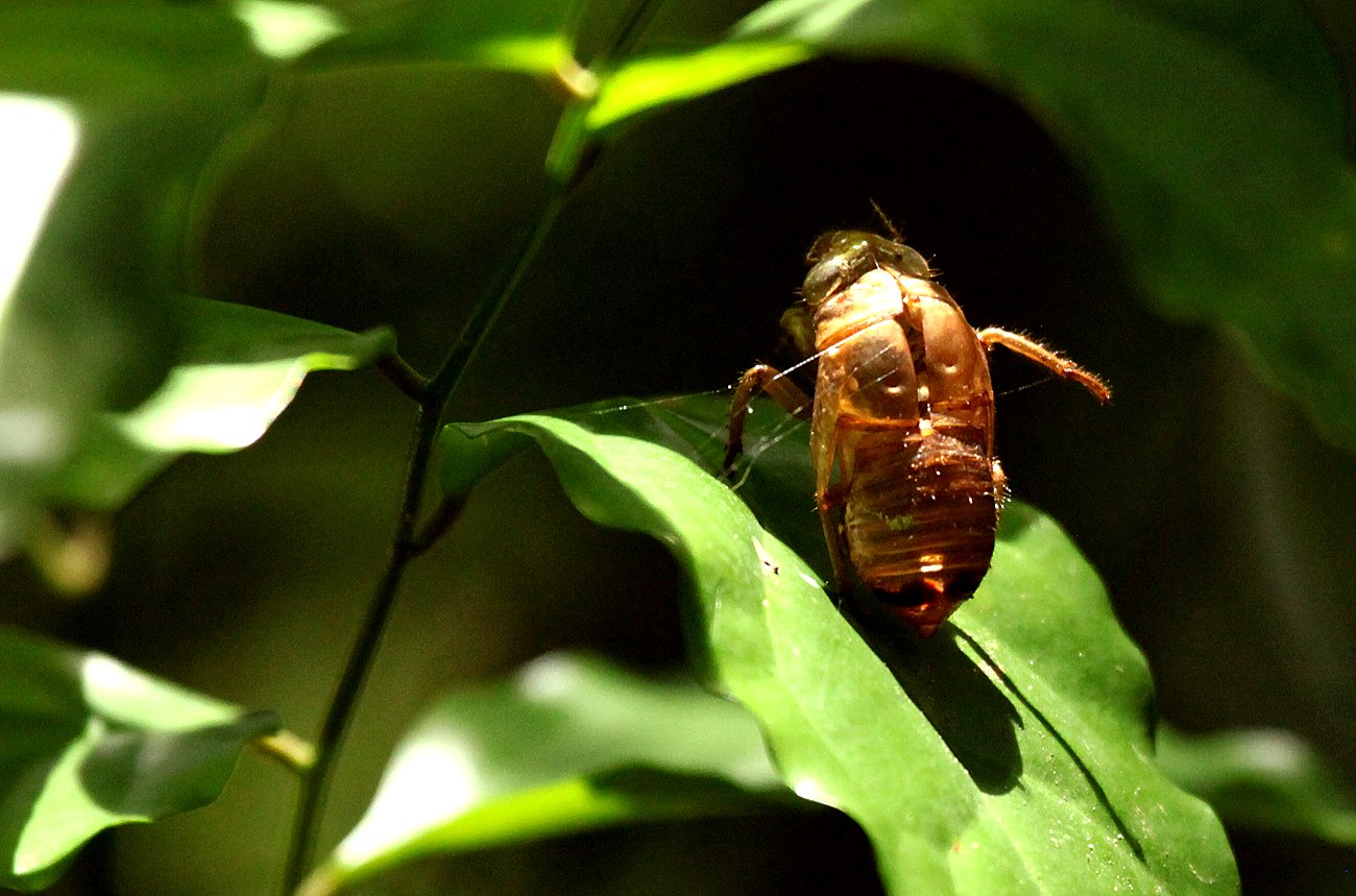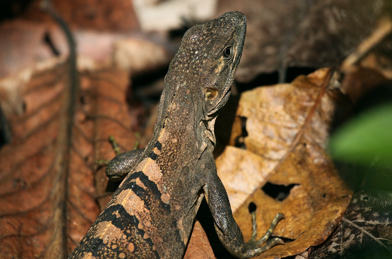 Er musterte ständig mit seinen Augen die Umgebung und fand immer wieder Neues, das er uns zeigte. Sein Spektiv , ein Vortex 60 mm , hat eine vorzügliche Bildqualität und ist sehr hell, ideal um im relativ dunklen Dschungel etwas zu erkennen. Wir entdeckten zahlreiche Eidechsen und Libellen. Plötzlich hörten wir lautes Krächzen in den Bäumen. Ja, da waren sie, die gesuchten Roten Aras (Scarlet Macaw). Tomoko fotografierte eifrig, was aber angesichts der Höhe der Bäume, in denen sie herum kletterten, zunächst keine guten Ergebnisse brachte. |