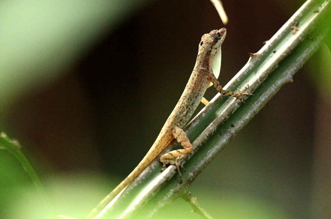 Tomoko hatte ihren Hut vergessen und nach einiger Zeit fühlte sie erste leichte Anzeichen einer Migräne. Wir hielten aber tapfer rund 4 Stunden durch, wobei wir zuletzt einige kleine Pausen einlegten und Wasser tranken. Auch meine Knie begannen zu schmerzen, gut dass wir mein kleines Stühlchen mitgenommen hatten. Mauricio zeigte uns eine Nachtschwalbe, die unglaublich gut am Boden versteckt war, so dass wir größte Mühe hatten, sie zu erkennen. Einmal folgte ich Mauricio, der einen Vogel suchte, während Tomoko auf dem Stühlchen sitzen blieb. Als wir ergebnislos zu ihr zurückkamen, lächelte Tomoko. Sie hatte inzwischen im Sitzen gesehen, was Mauricio vergeblich gesucht hatte, einen Violaceous Trogon. Dem etwas überheblich wirkenden Mauricio schien das nicht sehr zu gefallen. |