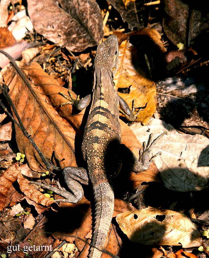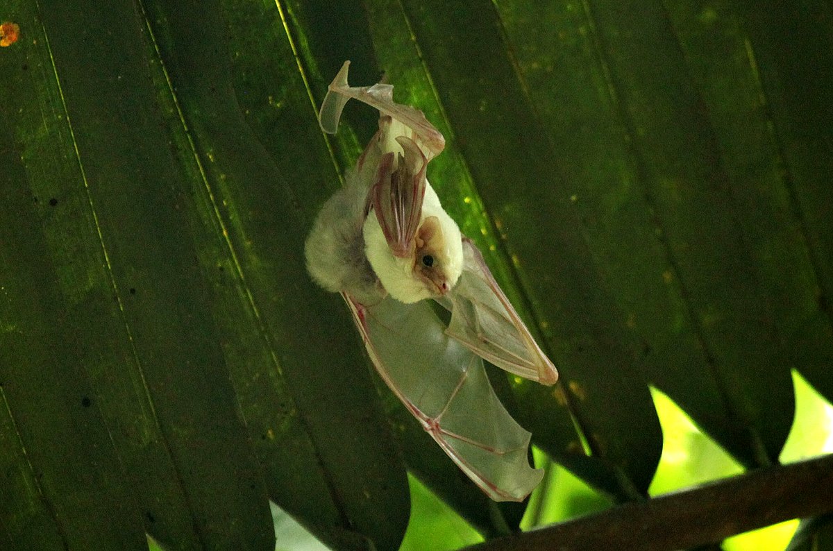 Um 8:00 h erschien pünktlich Mauricio. Wir fuhren mit ihm zusammen an seiner Wohnung vorbei, wo er noch Spektiv und Rucksack holte. Dann machten wir uns auf den Weg zum 20 km entfernten Carara Nationalpark. Das Wetter war inzwischen herrlich sonnig und warm. Auf der Fahrt die Küstenstraße entlang sahen wir zahlreiche Vögel am Himmel kreisen, meistens Geier, aber auch zahlreiche Fregattvögel. Gerne wären wir kurz ausgestiegen und hätten Fotos gemacht, doch Mauricio drängte zum Weiterfahren und meinte, dass wir bei der Rückfahrt ja noch Gelegenheit dazu hätten. Das war, wie sich später herausstellen sollte, ein Irrtum, denn die Vögel waren später nicht mehr da. Wir fuhren also weiter ohne anzuhalten. Gegen 8:45 h am Eingang zum Nationalpark angekommen, zahlten wir unsere Eintrittsgebühr von je 10,- $, fuhren aber ein kleines Stück weiter zu einem Nebeneingang in den Park. Hier stand ein Wächter, der gegen ein kleines Trinkgeld auf die abgestellten Autos aufpasst, wenn man sich auf den Trail in den Dschungel begibt. Die nachfolgende 4-stündige Wanderung durch den Urwald war sehr interessant, aber auch sehr anstrengend. Mauricio zeigte uns sehr viel. Zunächst ganz kleine weiße Fledermäuse (Northern Ghost Bat) hoch in einigen Palmwedeln, die wir nie ohne Führer gefunden hätten. |