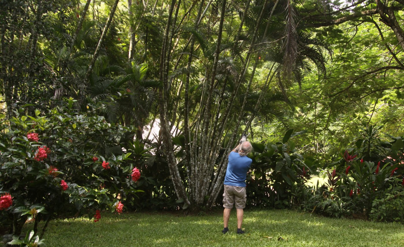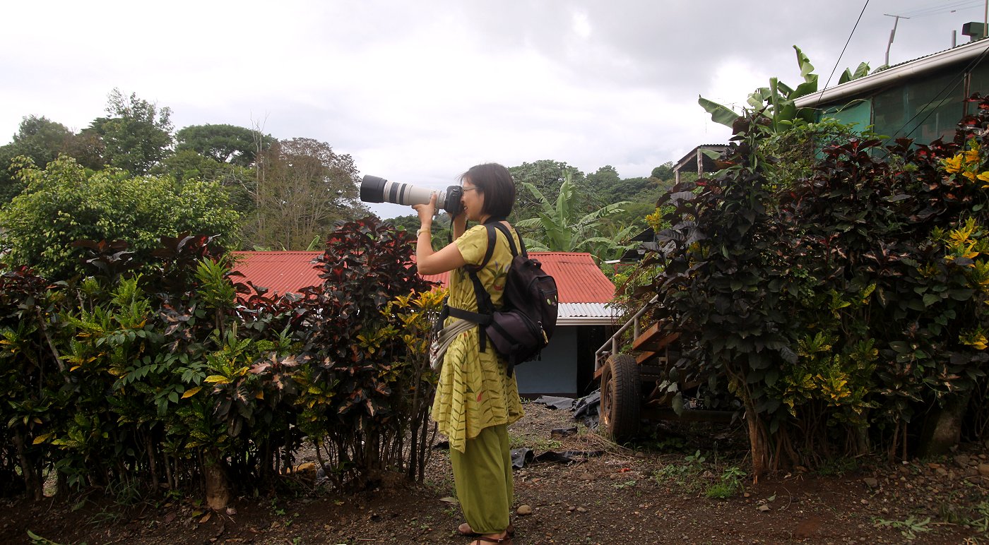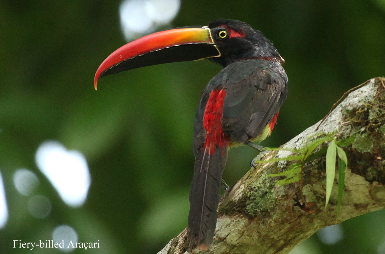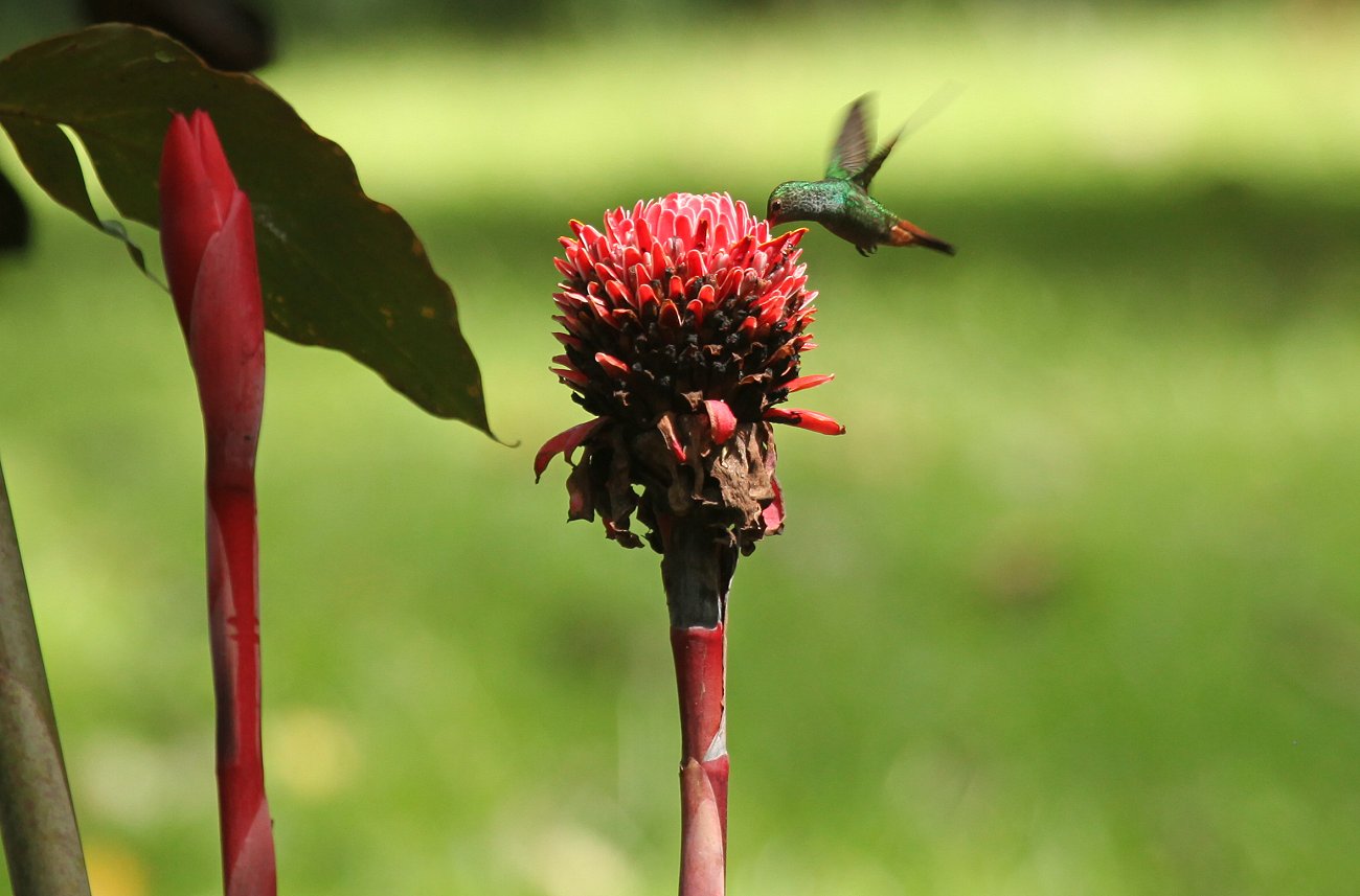 Die Sonne schien inzwischen heiß vom Himmel, die hohen Bäume um uns herum spendeten aber ausreichend Schatten. Viel war zunächst nicht zu sehen, bis plötzlich ein Fiery-billed Araçari heranflog und auf einem Ast sitzen blieb. Immer wieder tauchten auch Kolibris auf, die mit ihren langen Schnäbelchen die Blüten der zahlreichen blühenden Pflanzen nach Nektar untersuchten. |