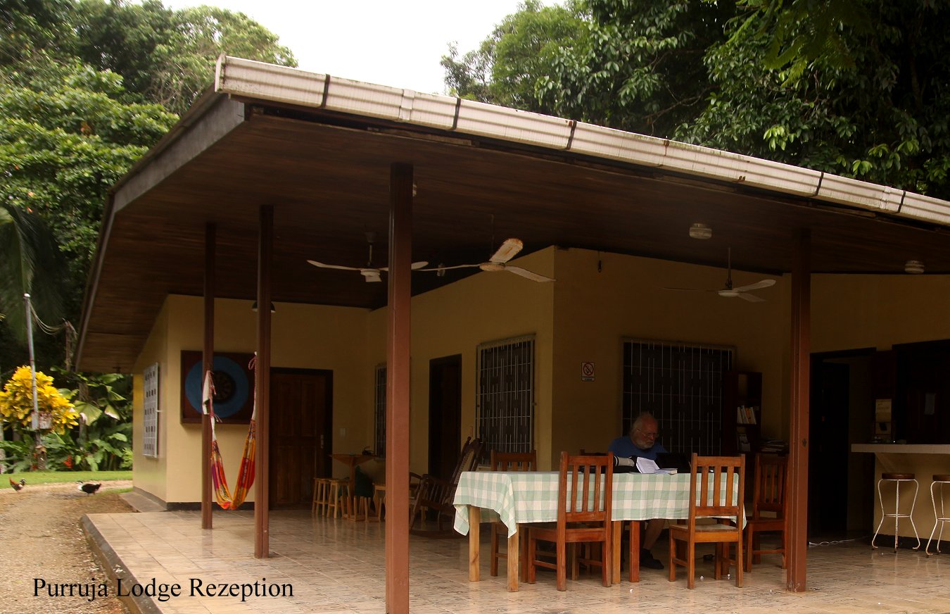 Nach 170 km erreichten wir gegen 12:15 h 6 km vor Golfito die Purruja Lodge, unser heutiges Ziel. Es ging einen kleinen Abhang steil nach unten, dann über eine schmale Brücke und wieder steil nach oben bis wir vor dem kleinen zentralen Gebäude der Lodge standen. Kein Mensch war zu sehen, stattdessen einige Vögel, wie ein Golden-hooded Tanager und ein uns unbekannter Vogel. |