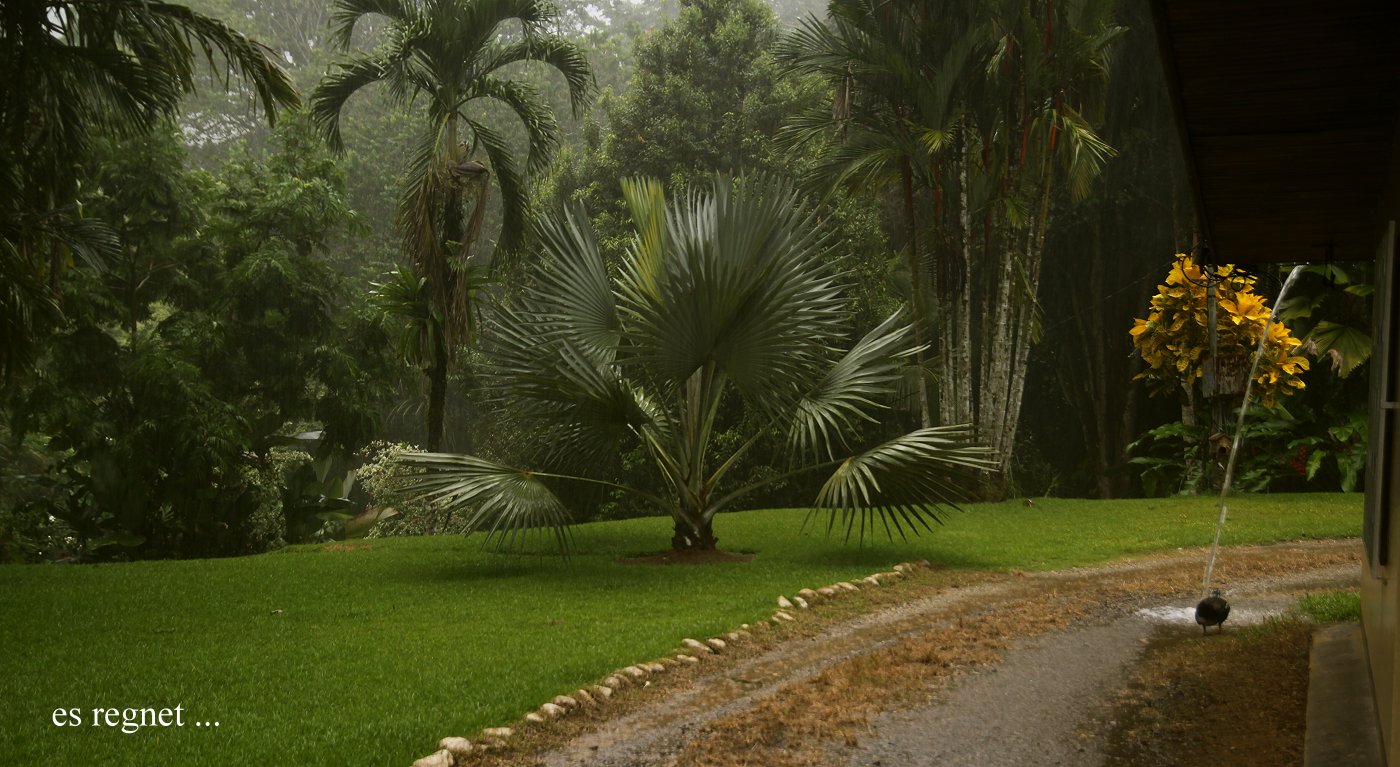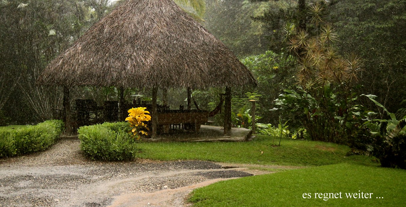 Den Nachmittag verbrachten wir ruhig auf unserer Terrasse. Ich schrieb schon mal Tagebuch, Tomoko arbeitete etwas mit ihrem Netbook. Später versuchte ich mal ins Internet zu kommen, bei unserem Zimmer gab es aber keine Verbindung. Die hatte ich, als ich zur Rezeption hinunter ging. Dort war der Empfang sehr gut. Tomoko kam etwas später mit ihrem Netbook hinzu. Gegen 16:00 h tauchten am Himmel dicke Wolken auf. Einige Donnerschläge kündigten ein Gewitter an. Die Squirrel Monkeys waren plötzlich wieder da, ebenso zwei Agoutis. Als es aber plötzlich anfing sintflutartig zu regen, verschwanden alle so schnell wie sie gekommen waren. Nur eine Gans spazierte herum und ließ sich durch den Regen nicht abhalten. |