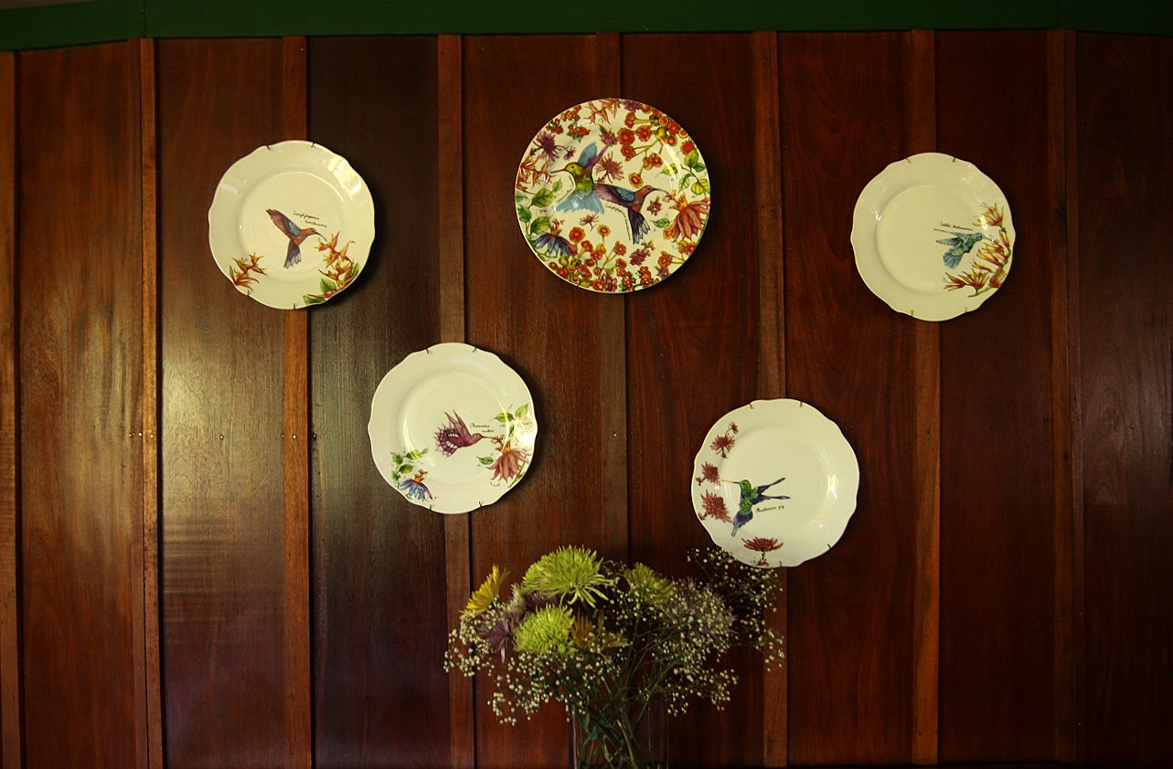 Nun wurde es aber Zeit fürs Frühstück. Dieses war von sehr guter Qualität. Es gab viel tropisches Obst. Ein Koch bereitete ein auf eigenen Wunsch zusammengestelltes Omelette vor. Tomoko freute sich, mal wieder Gallo Pinto essen zu können. An der Wand hingen wunderschöne mit Vogelmotiven (Kolibris) verzierte Teller. |