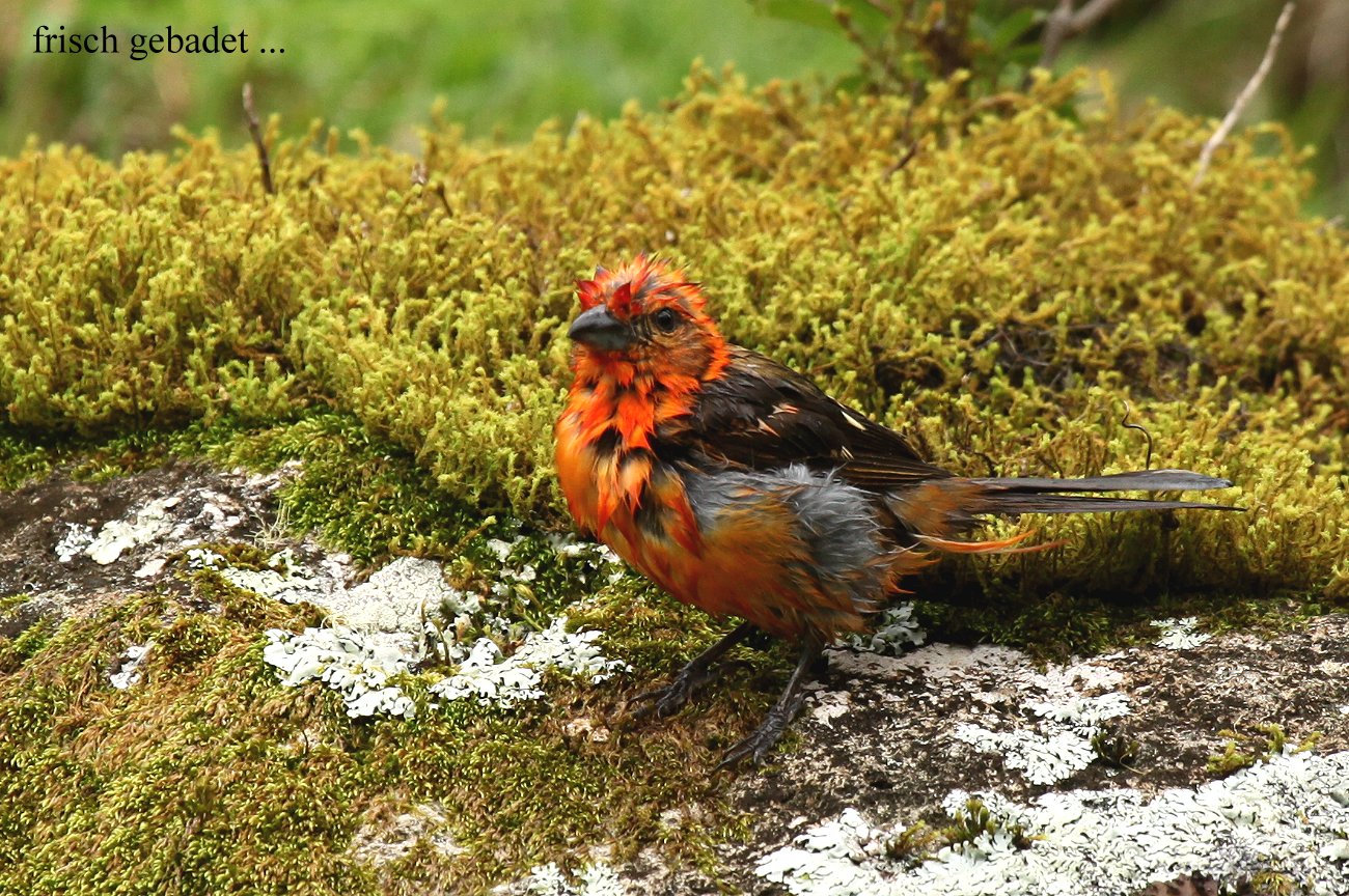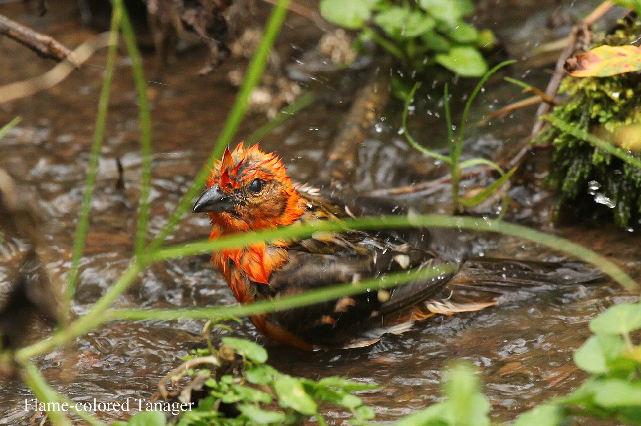 Obwohl wir nach dem reichhaltigen Frühstück eigentlich aufs Mittagessen verzichten wollten, verspürten wir gegen 12:30 h doch etwas Hunger. Also nahmen wir das Auto und fuhren nochmal ein Stück den Weg hinunter bis zu einem kleinen Restaurant „Kawaha“, wo Tomoko ein vegetarisches Sandwich und ich ein Casado, ein typisches Gericht in Costa Rica, bestellte. Dazu gab es einen leckeren Tamarind-Saft. Es ist erstaunlich, wie lecker hier in Costa Rica alle meist selbst hergestellten Obstsäfte schmecken. Beim Essen sprang Tomoko immer wieder mit ihrer Kamera auf, da sich einige hübsche Vögel zeigten (u.a. Tufted Flycatcher, Acorn Woodpecker, Sulphur-winged Parakeet, Spot-crowned Woodcreeper und Flame-colored Tanager beim Baden). |