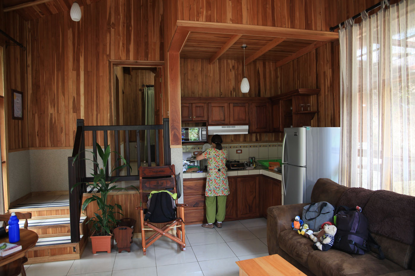 Wir trafen dort auf zwei ältere Damen aus Frankreich (Mutter und Tochter), mit denen wir ins Gespräch kamen. Die beiden sind ganz alleine mit einem Leihwagen unterwegs, was uns höchsten Respekt einflößte, war die Mutter doch offensichtlich älter als 80 Jahre. Wir gingen dann gemeinsam rüber zum Eingangsbereich um mal nach dem Quetzal zu sehen. 2 Führer hatten ihn offensichtlich in einiger Entfernung im dichten Laub entdeckt. Ich versuchte ihn mit dem Spektiv zu lokalisieren, was mir aber nicht gelang. Tomoko hatte kurz seinen Schwanz gesehen, doch auch ihr gelang es nicht, ihn mit dem Spektiv zu erfassen. Nebenbei entwickelte sich eine angeregte Unterhaltung mit den beiden älteren Damen, sowie einer Familie, ebenfalls aus Frankreich. Sie hatten mit 2 Kindern 120 $ Eintritt bezahlt, was wirklich saumäßig teuer ist. Der Eintritt in den Monteverde NP kostet inzwischen 20 $ pro Person (ohne Führer) . Die beiden älteren Damen hatten für eine Führung in einer Schokoladenfabrik 30 $ bezahlt. Ihr Kommentar dazu war: „Da ist der Louvre in Paris billiger und da gibt es mehr zu sehen...“ Wir beschlossen dann zu unserem Hotel zurückzufahren. Tomoko fing schon an zu kochen, während ich mein Tagebuch schrieb. Irgendwann war das Abendessen fertig. Es gab einen super schmeckenden Avocado-Salat, dazu eine Pasta mit Tomaten und Kapern. Der heute gekaufte Weißwein „Sauvignon Blanc“ passte gut dazu. |