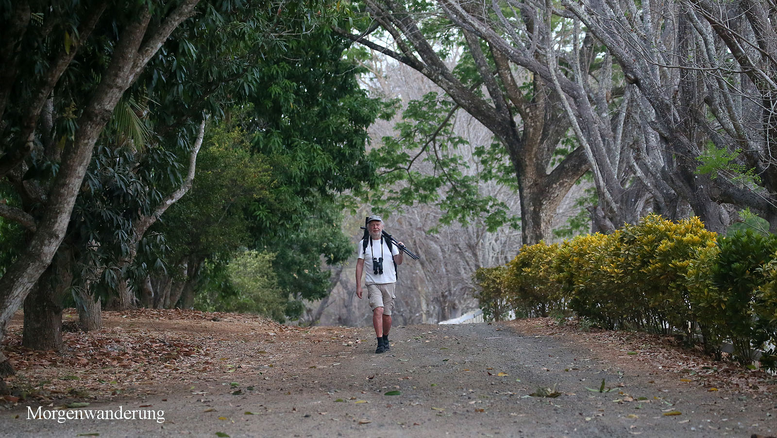 Wir schliefen beide gut in dieser Nacht. Um 4:20 h wurde der erste Brüllaffe aktiv. Wir schliefen aber trotzdem noch eine Stunde länger. Im ersten schwachen Schein der Dämmerung gingen wir gegen 5:40 h los zu einer Runde über das Gelände. Das Wetter war schön, leicht bewölkt und eine angenehme Temperatur von 27°. |