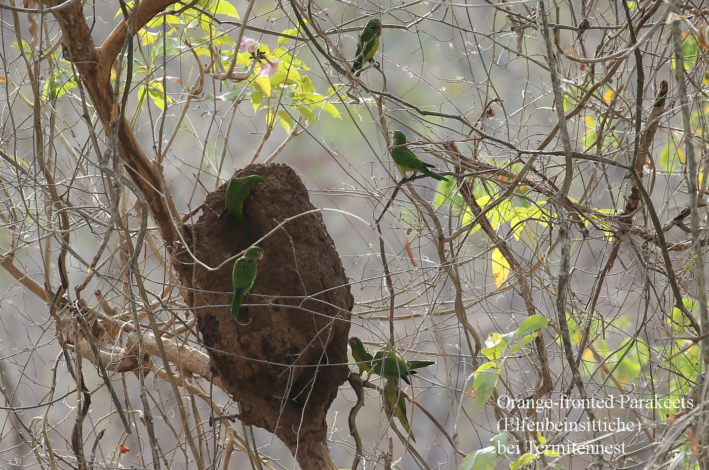 Die anschließende kleine Wanderung über den Trail Nr.2 war sehr ergiebig. Außer vielen Papageien sahen wir u.a. einen Motmot, sowie einen Coucal, von dem wir leider kein brauchbares Foto machen konnten. Es war heute wegen der Bewölkung nicht so heiß wie sonst in der prallen Sonne. Die Gegend war aber sehr trocken, ein Wasserloch war fast ausgetrocknet. |