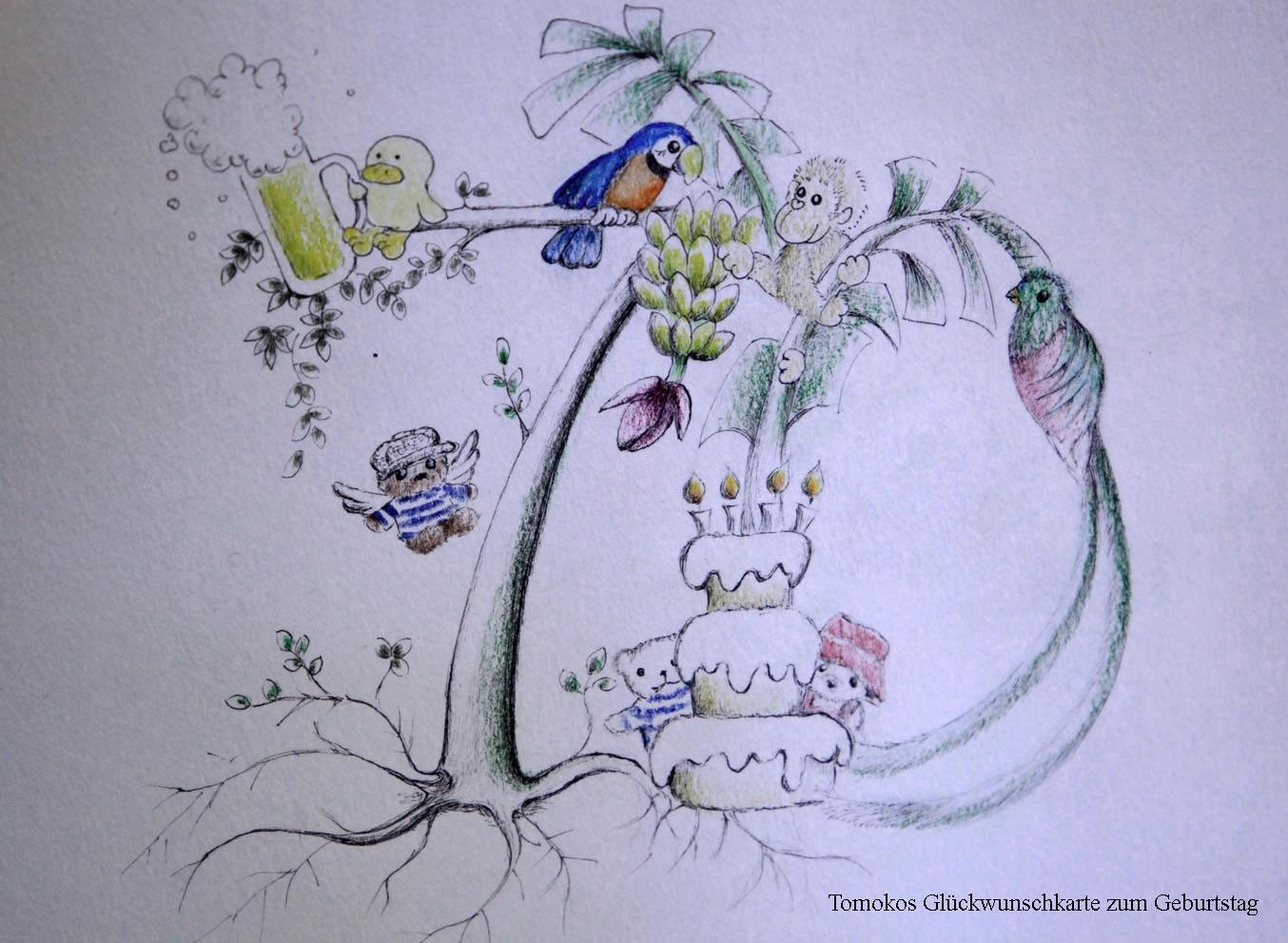 Wir wurden um 5:20 h wach. Das Doppelbett war sehr groß und mit einer unglaublich bequemen Matratze ausgestattet. Auch die Bettwäsche fühlte sich sehr angenehm an. Infolgedessen hatten wir gut geschlafen. Heute war mein 70. Geburtstag. Tomoko hatte eine wunderschöne Geburtstagskarte gemalt und alle mitgekommenen Tiere (Pa'chen, Brumma, Äffchen, Entelchen, Bärchen und Krächzi) haben auch ganz herzlich gratuliert. Nach einem ersten Kaffee und einem Schinkentoast fuhren wir um 6:15 h los die 3 km bis zum Eingang des Monteverde Nationalparks. Kurz vorher bogen wir mal kurz ab zu einen relativ unbekannten Park , Curi-Cancha Reserve. Der war aber um 6:45 h noch nicht offen, so dass wir weiterfuhren. Es nieselte ein wenig, als wir beim Monteverde Nationalpark ankamen. Vom Quetzal keine Spur, dafür ganz nah ein Black Guan. |