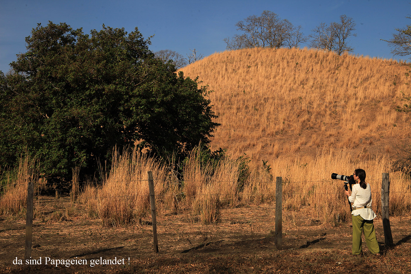 Es war sehr eindrucksvoll, die typischen Geräusche eines Bauernhofs aus direkter Nähe zu erleben. Wir fuhren weiter. Mir kam die Gegend irgendwie bekannt vor. Wir durchquerten wieder einige trockene Flussbette. Als ich in einem dieser Flussbette das Wurzelwerk eines großen Baums erblickte, den ich gestern schon fotografiert hatte, wurde mir plötzlich klar, dass wir auf dem gleichen Weg unterwegs waren wie gestern. An der nächstbesten Stelle wendete ich das Auto und wir fuhren zurück. Das erwies sich als großes Glück, denn kaum waren wir ein paar Hundert Meter gefahren, als wir wieder Gelbnackenamazonen erblickten, die sich in einem nahen Baum niederließen. Tomoko stieg aus und fotografierte unermüdlich. |