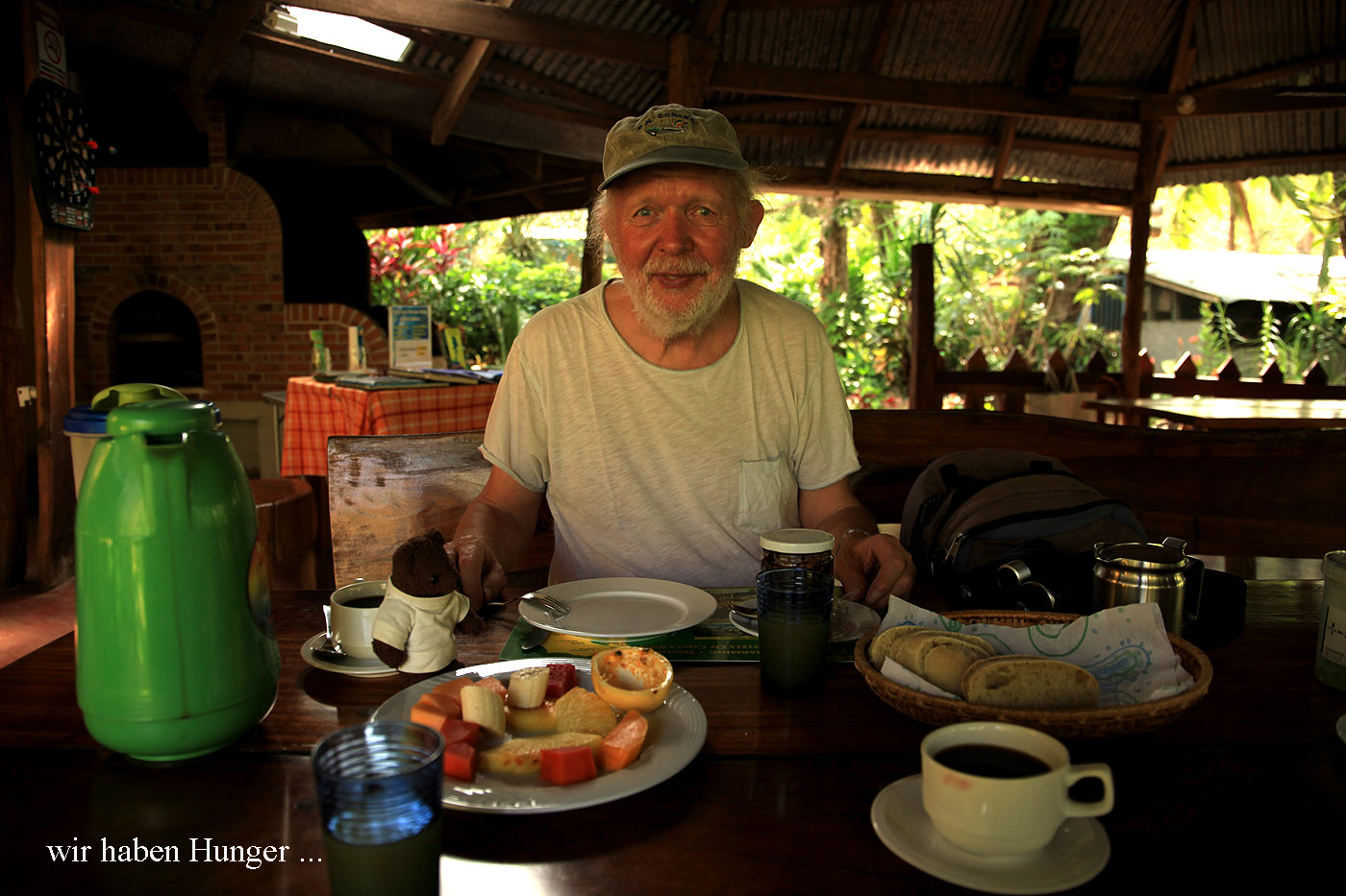 Manche der Vögel hatten einen kräftigen gelben Fleck im Nacken, andere, wahrscheinlich Jungvögel, kaum oder gar nicht. Irgendwann waren alle Amazonen wieder in den nahen Büschen verschwunden. Tomoko war überglücklich. Da es langsam Zeit war für ein Frühstück, fuhren wir zurück. Kurz vor erreichen der Finca standen 2 Kühe auf dem Weg und blockierten die Brücke, gaben aber nach ein paar Minuten den Weg frei. Gegen 9:00 h kamen wir an und gingen auch gleich nach vorne zum Rancho, wo uns wieder ein schmackhaftes Frühstück serviert wurde. besonders das Rührei mit Petersilie sowie das selbst gebackene Brot schmeckten vorzüglich. Für unser Bärchen war natürlich das Marmeladenbrot am wichtigsten. Die Fledermäuse waren auch wieder im Kamin zu sehen. |