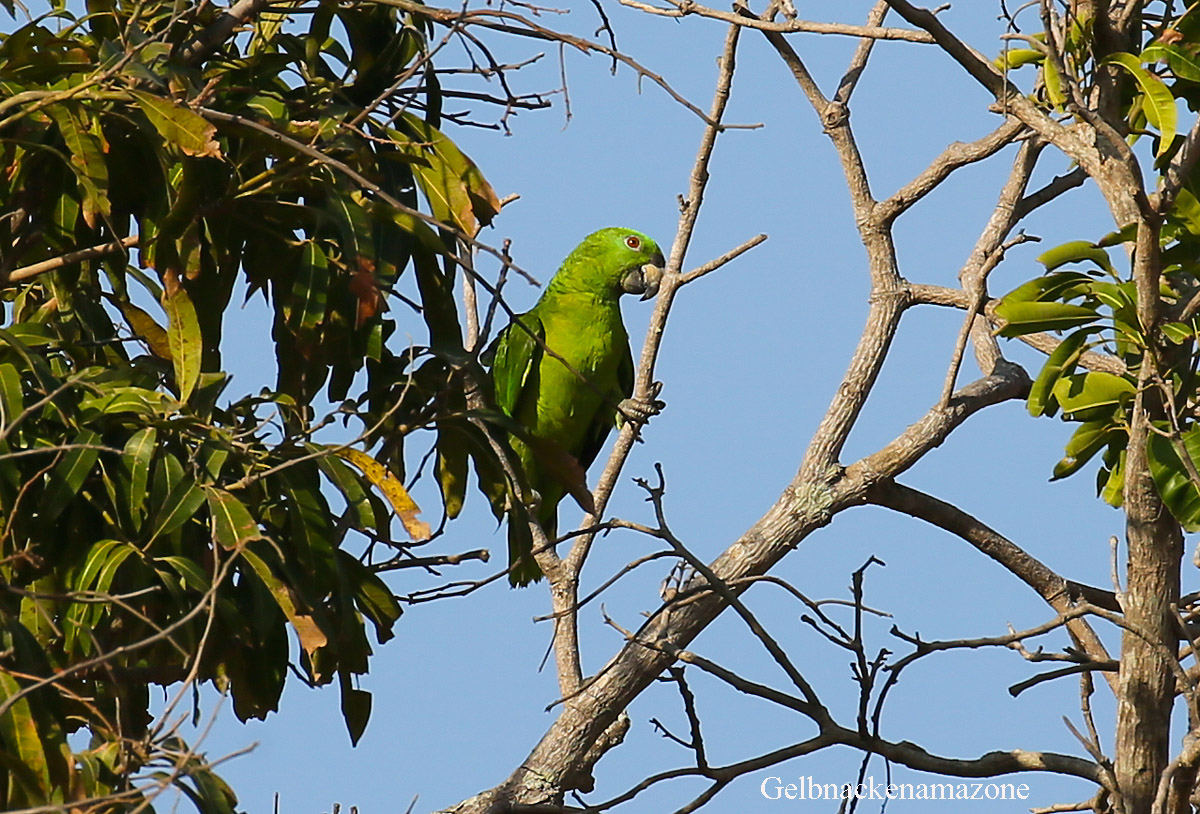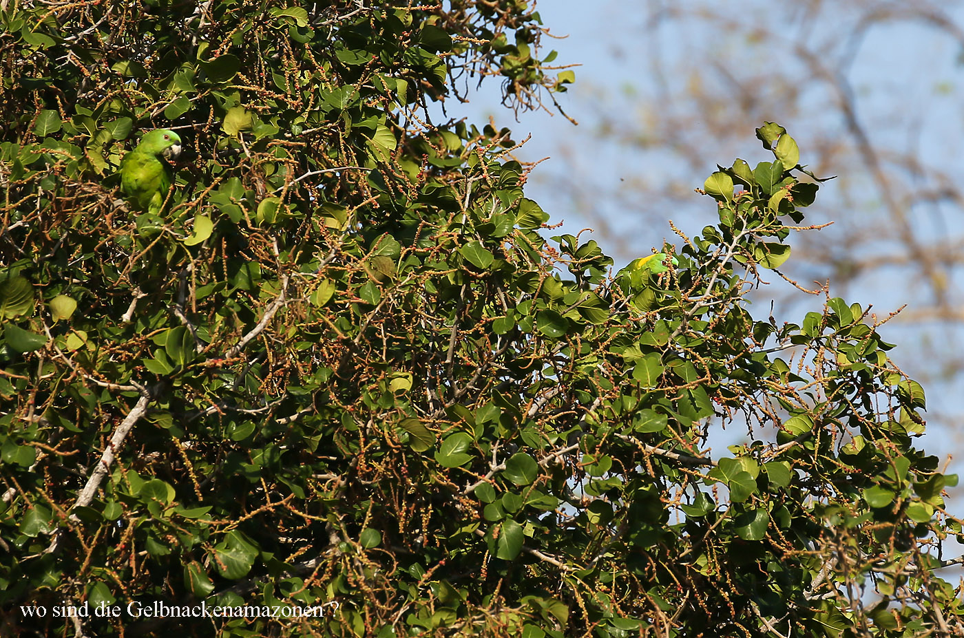 Wir fuhren weiter. Ich bog in einen kleinen Weg ein. Wir passierten einige kleine Ansiedlungen. Immer wieder hörten wir die Rufe der Amazonen, die eher dem Quaken einer Ente ähnelten als dem Krächzen eines Papageis. Endlich sah ich wie 2 Gelbnackenamazonen in einem Baum landeten. Schnell ergriff Tomoko ihre Kamera und stieg aus. |