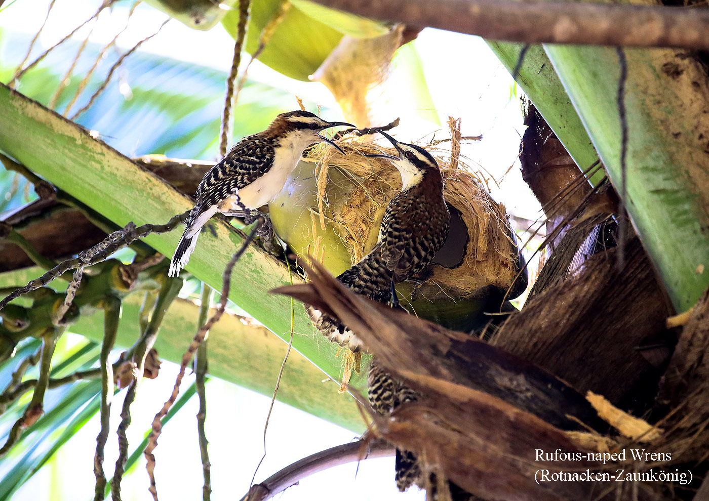 Zwischendurch gab es immer wieder etwas zu sehen, besonders einige Rufous-naped Wrens waren sehr aktiv. Auch kam immer wieder ein Kolibri zu den Blüten der Heliconia-Pflanzen neben unserer Terrasse. |
