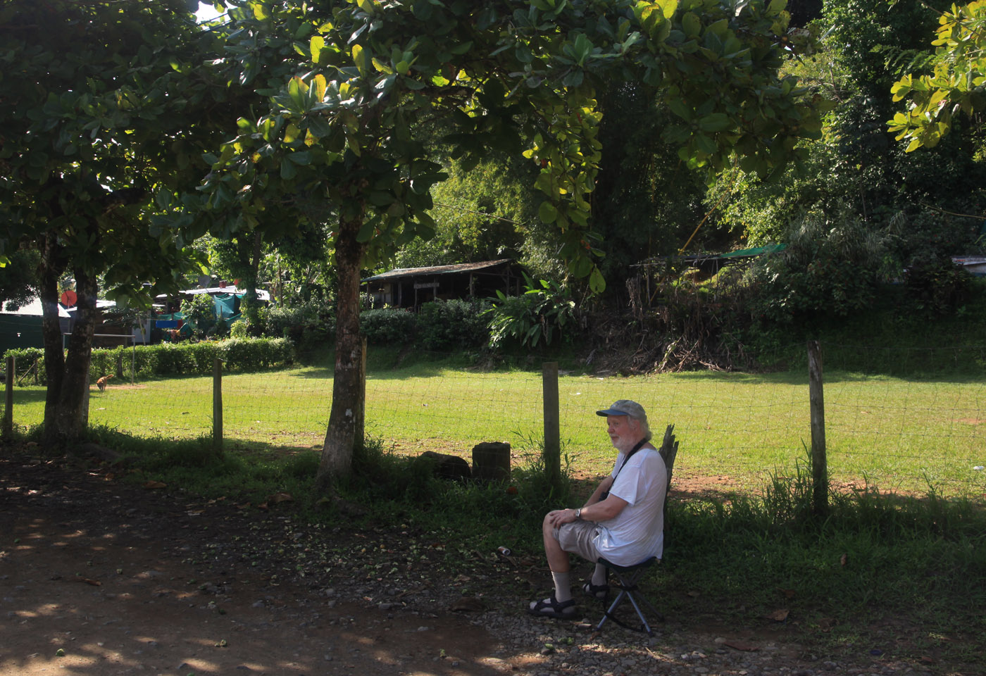 Wir versuchten möglichst im Schatten zu bleiben, was aber nicht immer möglich war, so dass mein T-Shirt in kürzester Zeit patschnass war. Ich entdeckte einen leuchtend grünen Iguana, der von einer Kokuspalme kletterte und begann die saftigen Pflanzen am Boden zu fressen. Tomoko konnte sich gar nicht satt sehen an den Papageien und fotografierte in einem fort. Ich nahm derweil mein Stühlchen aus dem Auto, setzte mich unter eine Palme und ließ meine Blicke über das Meer in die Ferne schweifen. |