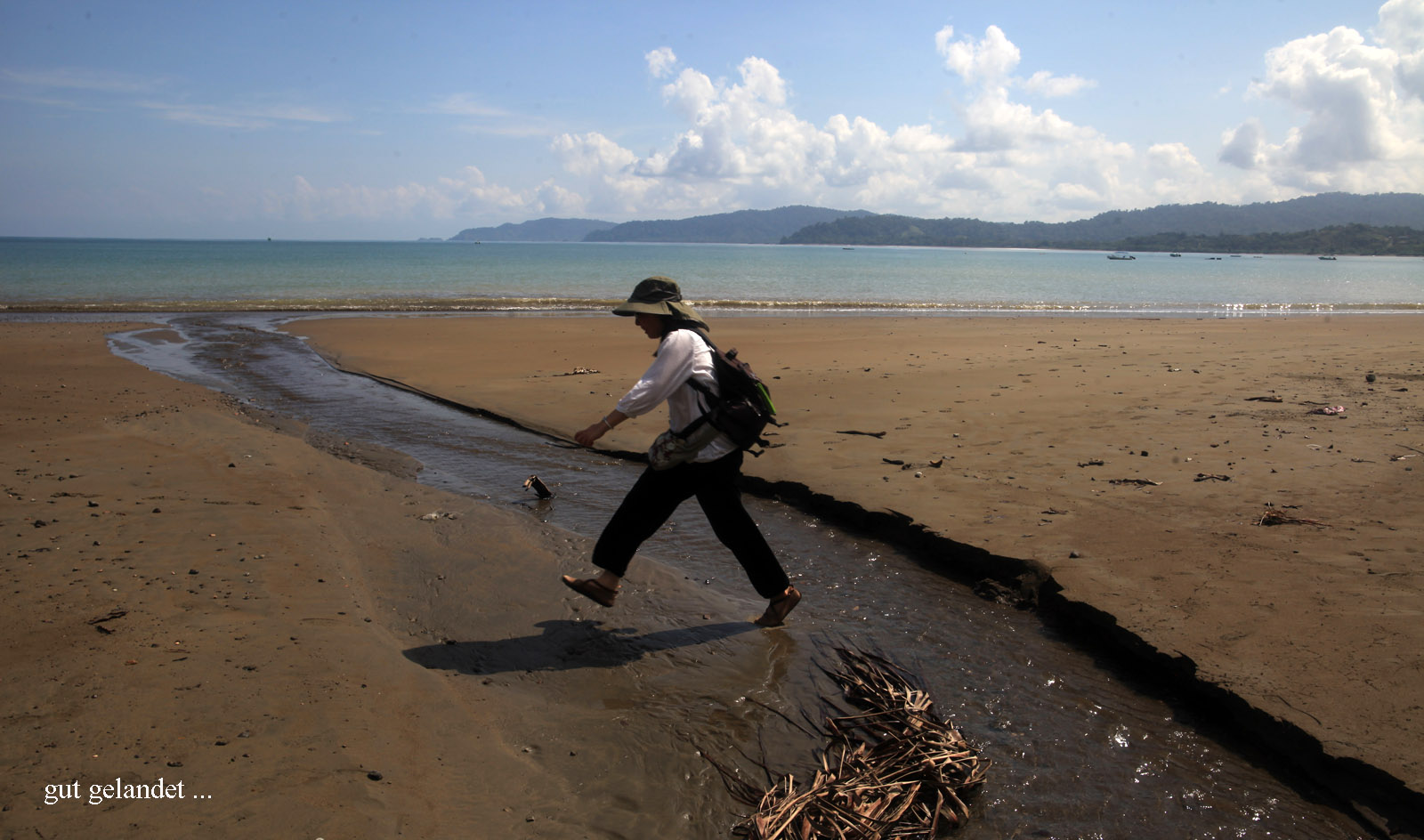 Irgendwann machten wir doch ein paar Schritte durch die heiße Sonne am Strand entlang bis zum Ende. Dabei mussten wir einen kleinen Bach überspringen. Man könnte den sich anschließenden Trail etliche km weiter durch den Dschungel wandern. Darauf verzichteten wir aber wegen der enormen Hitze. |