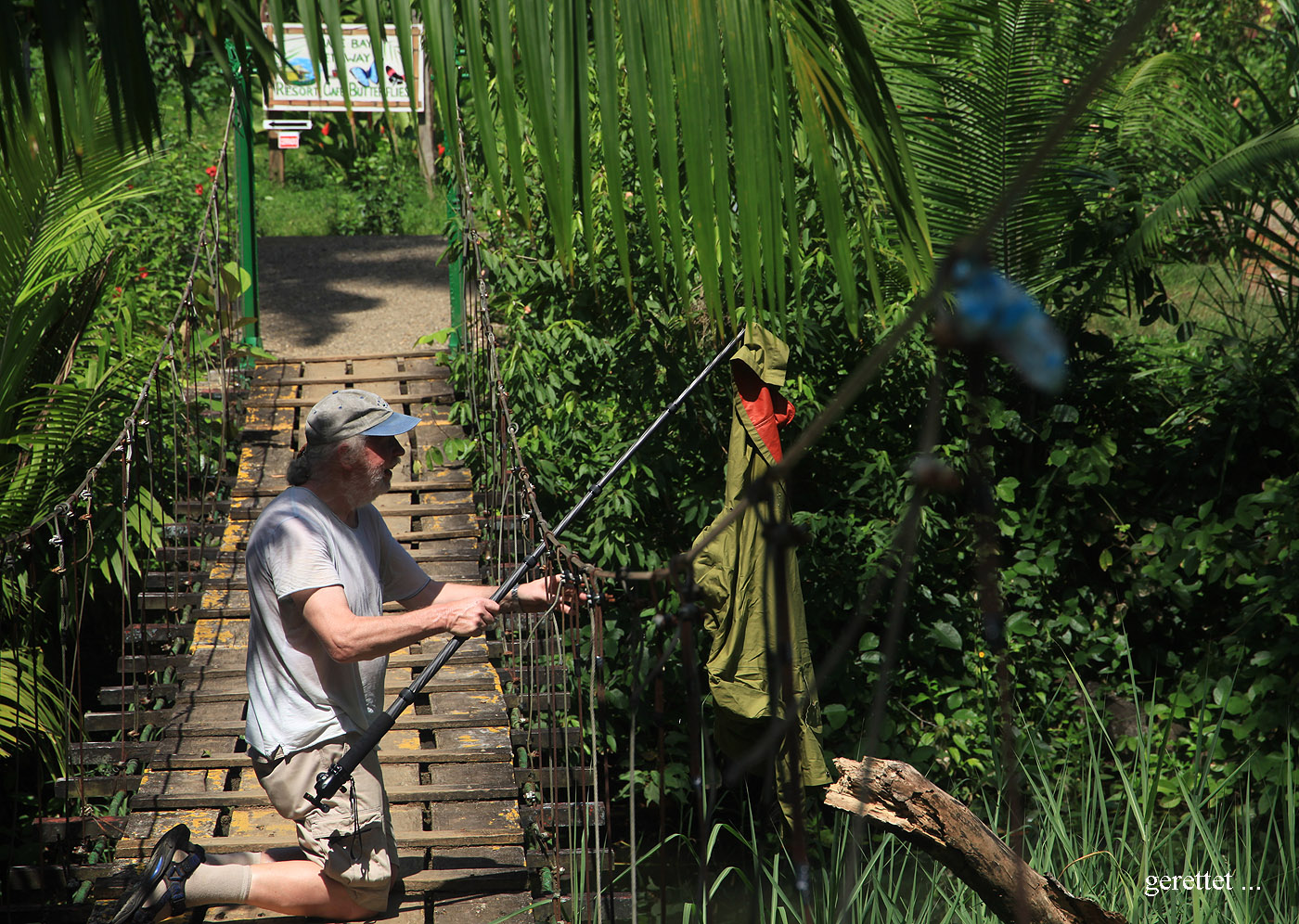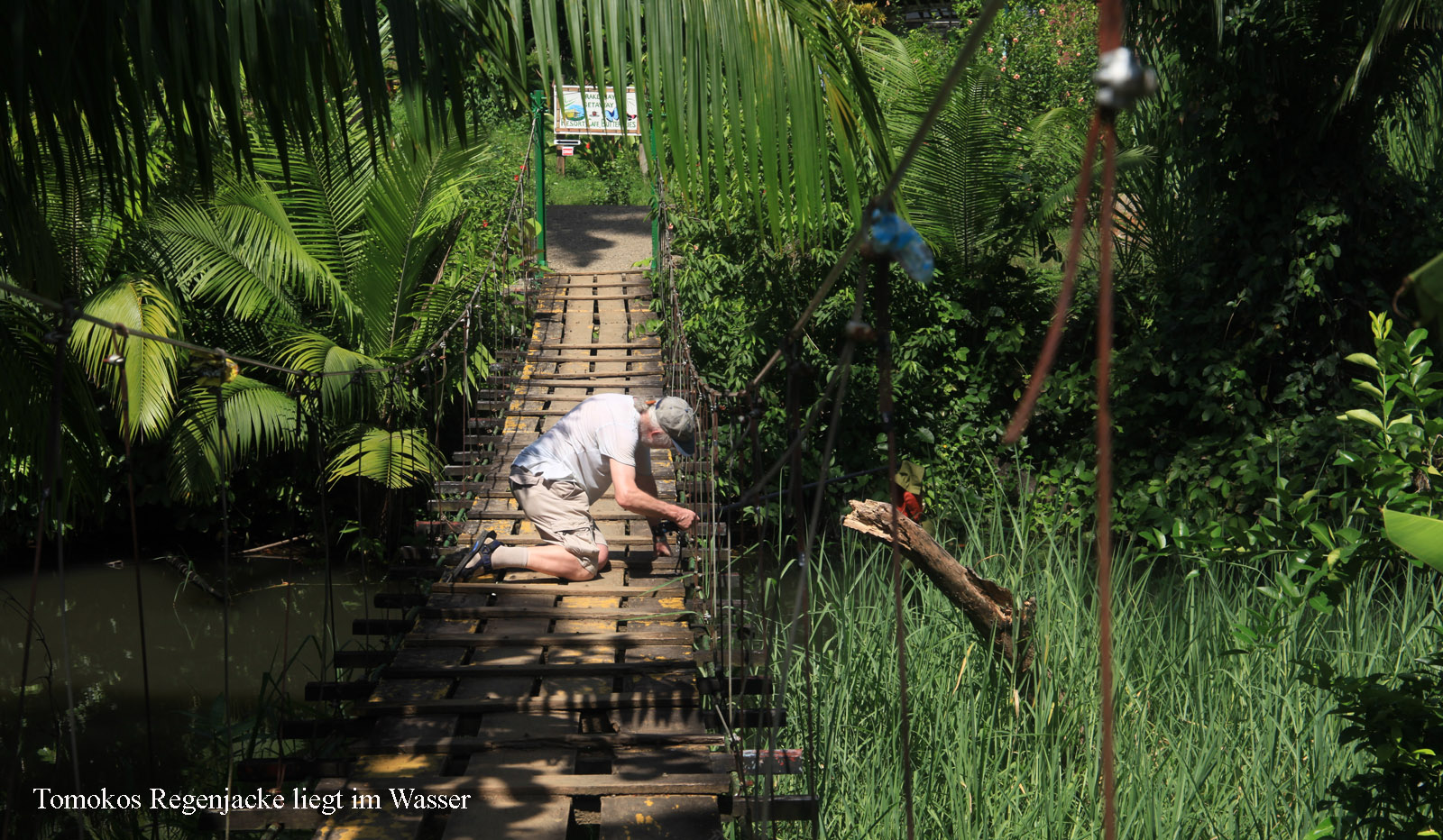 Wir gingen um die kleine Lagune herum. Dabei mussten wir eine niedrige schwankende Hängebrücke überqueren. Als Tomoko gerade in der Mitte der Brücke war, öffnete sich plötzlich ihr Rucksack und ihre Regenjacke sowie Wasserflaschen fielen heraus. Während die Wasserflaschen auf der Brücke liegen blieben, fiel die Regenjacke ins Wasser. Tomoko gab mir ihr Einbeinstativ. Es gelang mir damit die Jacke wieder aus dem Wasser zu fischen. Gleich neben uns scharrte ein Huhn mit zahlreichen jungen Küken kräftig am Boden zwischen heruntergefallenen Kokosnüssen und pickten eifrig. |