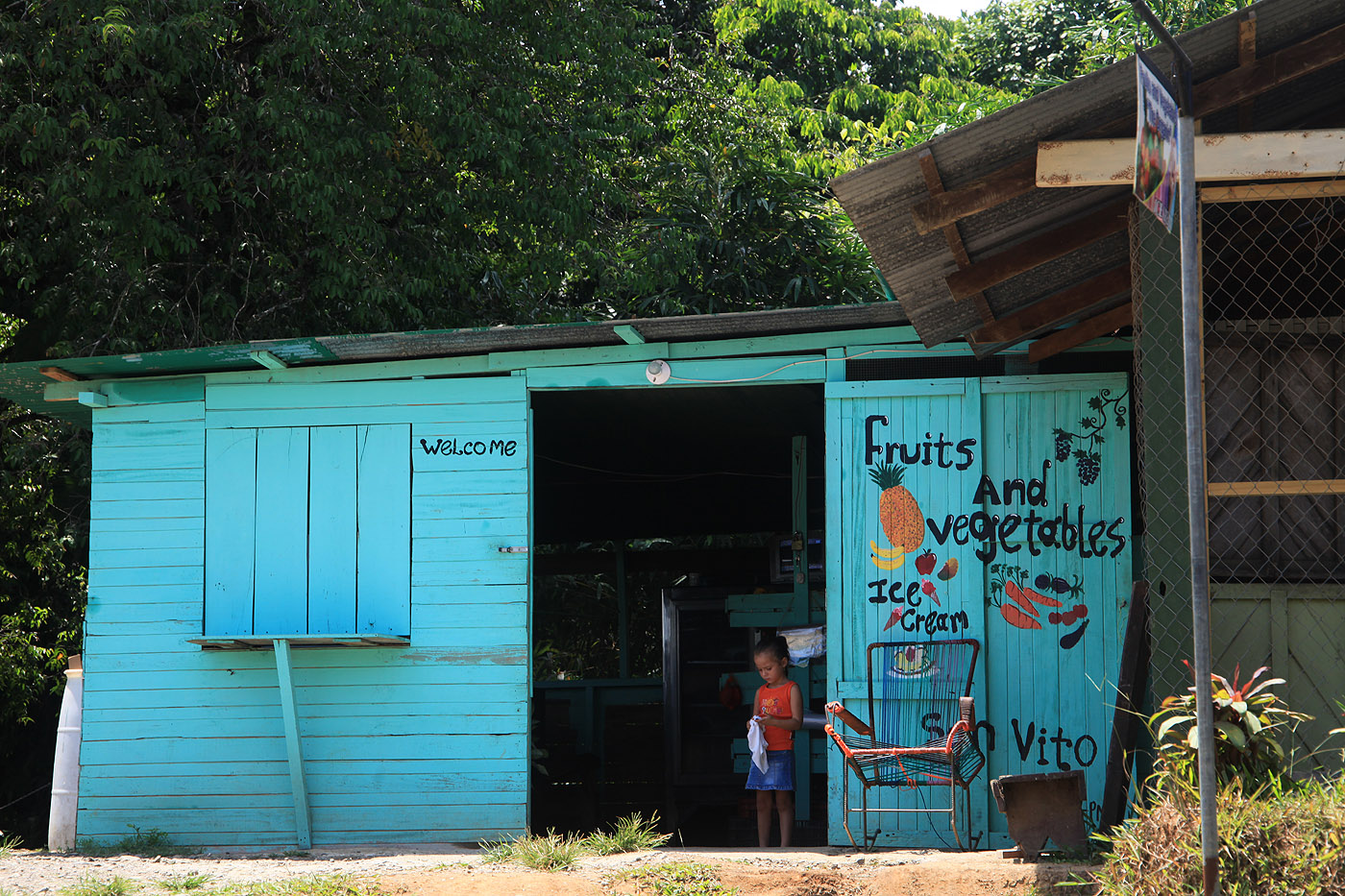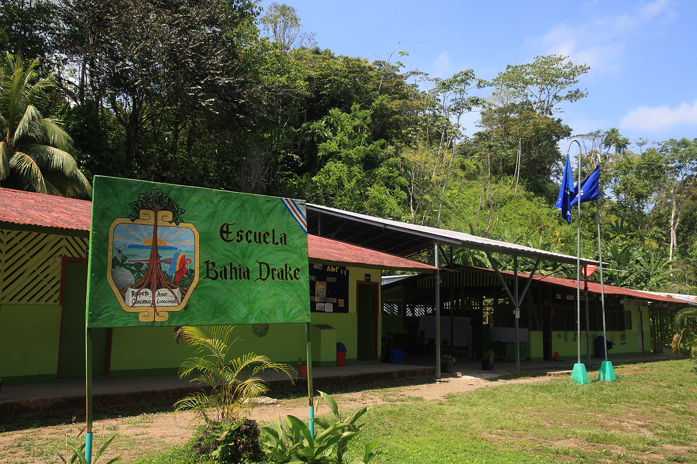 Um 7:20 h fuhren wir los ins Dorf Drake Bay Richtung Strand. Wir parkten das Auto unter einem schattigen Baum nahe einer Schule. Am Boden entdeckten wir heruntergefallene Mandelreste. |