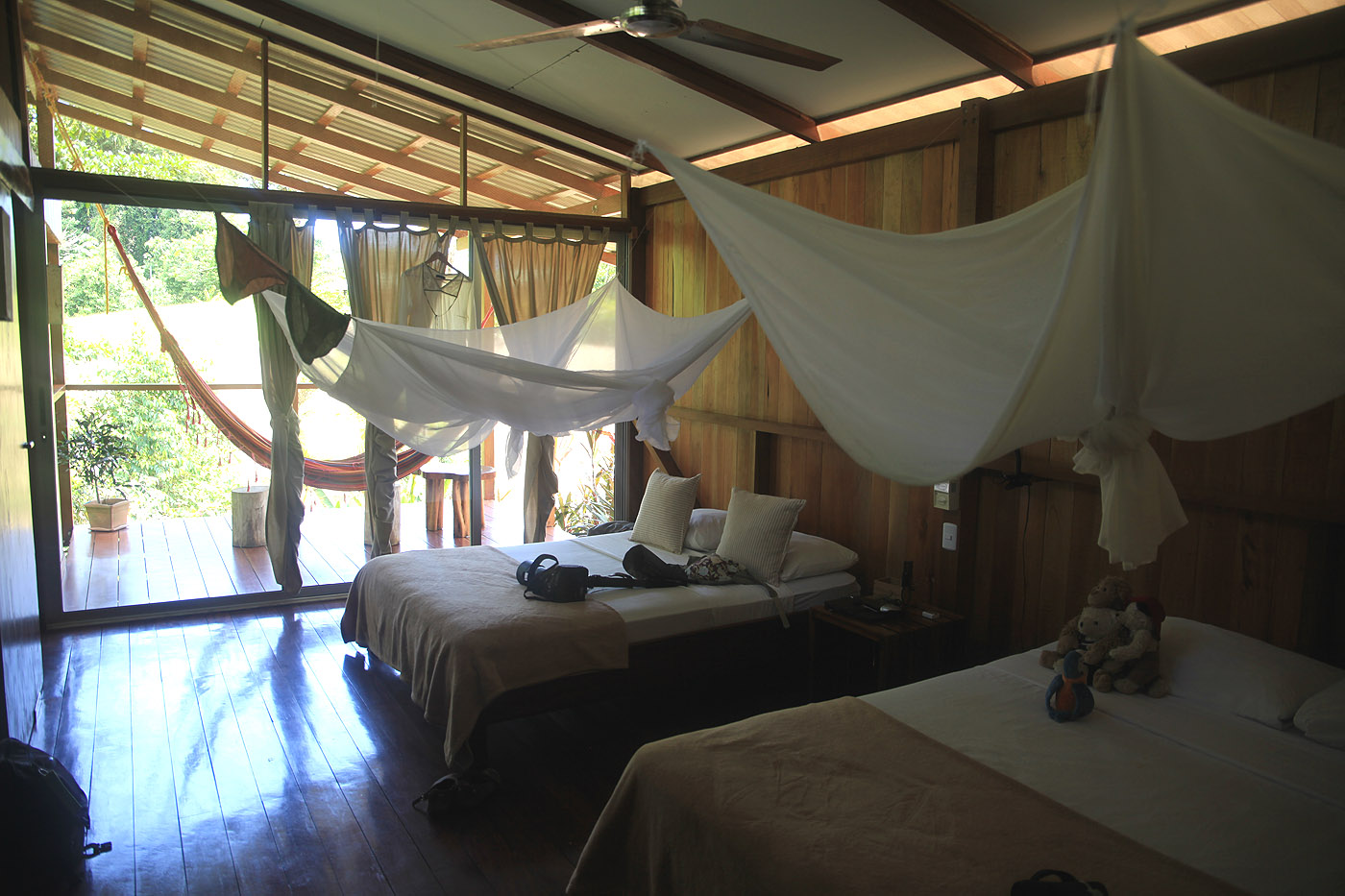 Nun fuhren wir aber endlich zurück zur Finca Maresia. Unser Zimmer war schon gemacht und das Zimmermädchen hatte unsere Tiere in einer netten Gruppe gemeinsam auf meinem Bett positioniert. Wir zogen unsere total verschwitzten Klamotten aus und erfreuten uns an einer erfrischenden Dusche. Ein wenig ruhten wir in den beiden Hängematten aus. Gegen Mittag gingen wir mal rauf auf den „Feldherrenhügel“, wo sich die Rezeption und die Küche befinden. Ich bestellte mir zur großen Freude der Bären ein Bananeneis, Tomoko aß ein Käsesandwich. Dazu tranken wir einen wie immer sehr starken Kaffee. Wir hatten unsere Netbooks mitgebracht. Ich schaute Emails und etwas Internet und fing dann mit meinem Reisebericht an. Tomoko hatte etwas Probleme mit ihrer Computermaus und ging nach einer Weile wieder zurück zum Zimmer. Ich folgte wenig später. Hier verbrachten wir den ganzen Nachmittag bei 33° im Zimmer, mal etwas schlafend , dann wieder in unseren Hängematten schaukelnd. Der Himmel war inzwischen bedeckt, doch außer einem fernen Grollen, das auf ein Gewitter hindeutete, passierte nichts. Es blieb weiterhin trocken. |