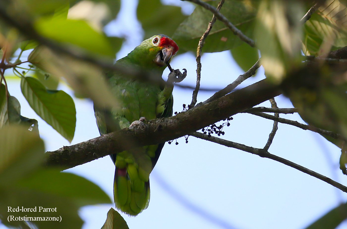 Um 6:00 h gab es schon Frühstück. Wir waren als erste vor Ort. Man konnte aus vier Variationen wählen. Ich wählte außer dem Obstteller Gallo Pinto mit Spiegelei, Tomoko aß diesmal Pancakes. Der Kaffee dazu war ganz schwarz und stark. Tomoko drehte sich beim Frühstück fast wie ein Propeller, da ständig Rote Aras, Tukane und andere Vögel vorbeiflogen. Zurück im Zimmer packten wir unsere Fotosachen ein und gingen zu unserem Auto. Gerade als wir die Finca Maresia verlassen wollten, entdeckte Tomoko zwei Rotstirnamazonen (auch Gelbwangenamazonen genannt) relativ niedrig und nah in einem Baum. Dabei wurde sie von zahlreichen Moskitos attackiert. |