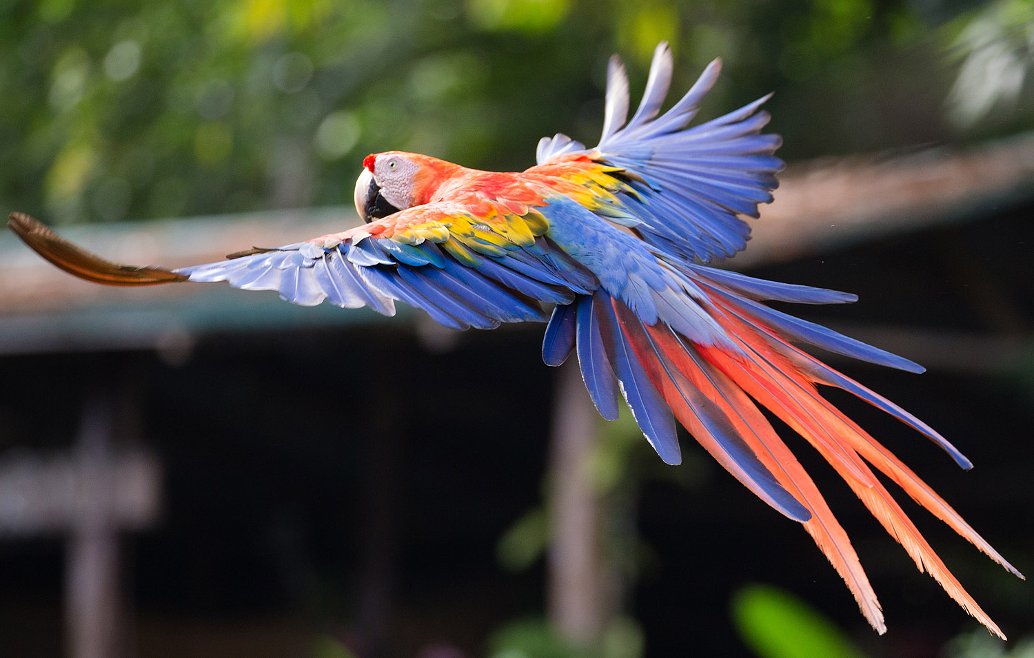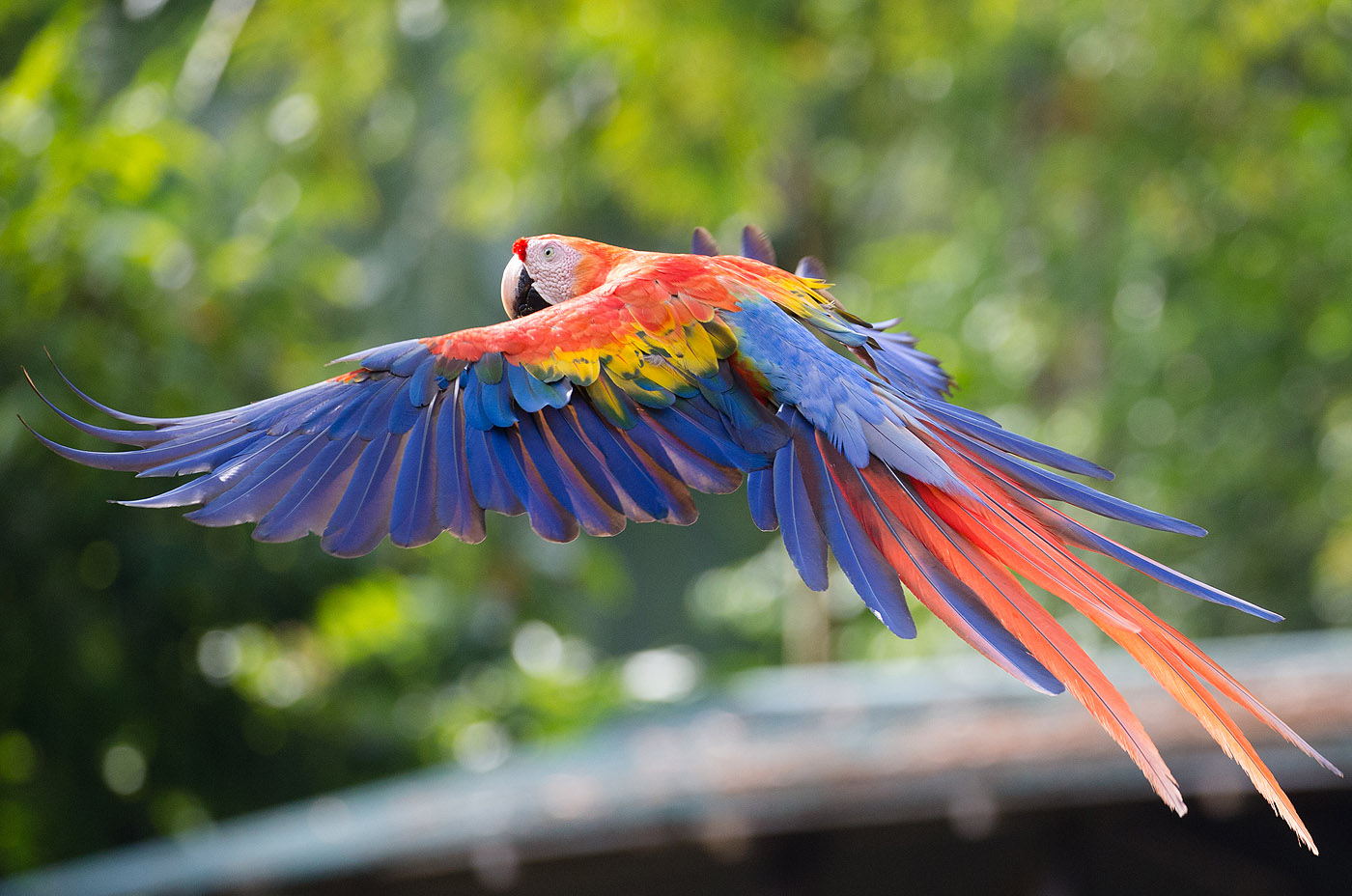 Eine nette einheimische Frau deutete auf einen Baum, in dem wieder 2 Lapas (Rote Aras) genüsslich grüne Mandel-Früchte verzehrten. Am heutigen Samstag war die Schule geschlossen, das Tor zum Schulgelände stand aber offen. Wir gingen hinein auf die grüne Wiese, die als Sportplatz dient. Von hier hatten wir einen guten Blick auf die Aras. |