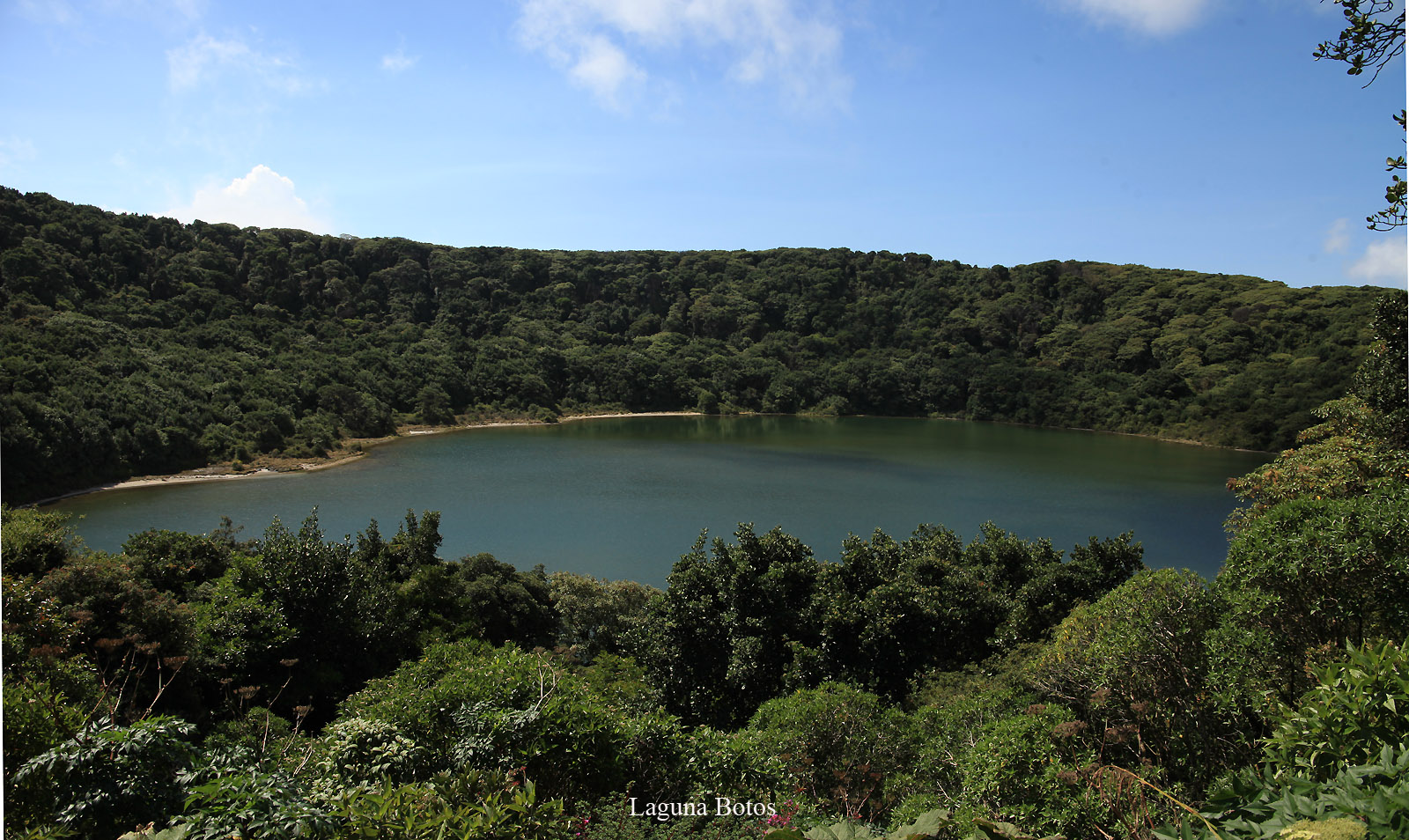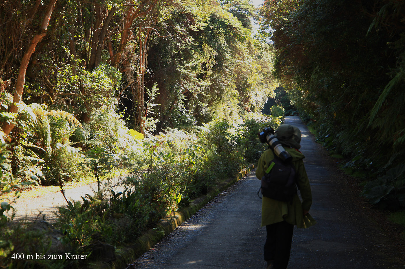 Es gab noch einen 800 m langen Trail zur Laguna Botos, einem alten Kratersee, der jetzt mit Regenwasser gefüllt ist und im Gegensatz zum Hauptkrater mit dichtem grünen Wald umgeben ist. Der steil ansteigende Trail wirkte wie ein dunkler Tunnel, so dicht stand das Unterholz. Die Lagune lag dann wieder in schönstem Sonnenlicht. |