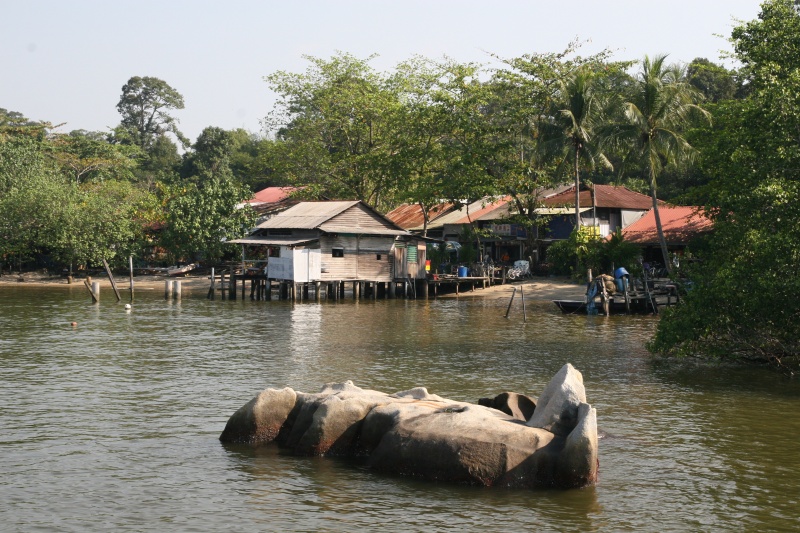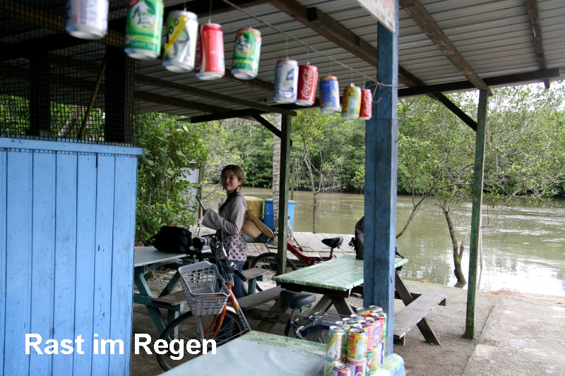 Wir suchten Schutz in einer kleinen Hütte am Wegesrand und warteten erst mal einige Zeit.Doch es regnete kräftig weiter. Nach einiger Wartezeit wurden wir ungeduldig. Da es keine Anzeichen auf Besserung gab, packten wir unsere Regenschirme aus und fuhren zurück zur Bootsanlegestelle . Es gab nicht genug Leute für eine Rückfahrt. Die Kapitäne warten immer, bis ein Boot mit 12 Personen voll ist. Da wir nur 5 waren, beschlossen wir, den Gesamtfahrpreis von 30 S$ für ein Boot gemeinsam aufzubringen. Also zahlte jeder 6S$ anstatt 2,50 S$, und wir konnten endlich losfahren. Leider vergaß ich meinen schönen Entenschirm bei der Abfahrt. In Singapur angekommen, aßen wir in einem kleinen chinesischen Restaurant. Am Abend experimentierte ich viel mit unserem neuen Netbook und surfte im Internet. Morgen soll es dann nach Malaysia gehen, wir sind gespannt….. |