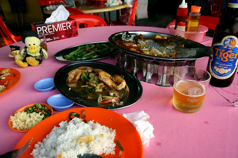 Schnell zum Supermarkt, Wasser und Bier kaufen. Vorher aß Tomoko noch ein leckeres Süppchen, und wir tranken beide einen eiskalten Saft (Mango und Kokosnuss), für mich schon fast zu kalt. Angesichts des herrlichen Wetters verbrachten wir den Nachmittag am Swimmingpool des Hotels. Kein Mensch weit und breit zu sehen, nur ein paar Affen näherten sich neugierig. Also alles sicher im Rucksack verpacken, man weiß ja nie, was die so im Schilde führen…. Wir konnten am Pool noch einen prächtigen Blauschwanzspint, eine Bienenfresserart (Blue-tailed Bee-eater), fotografieren. Nach dem Schwimmen duschten wir, zu Tomokos Verdruss gab es kein warmes Wasser. Zähneklappernd ertrug sie die Prozedur. Zum Abendessen fuhren wir in ein nahe gelegenes Dorf und fanden ein chinesisches Open-Air-Restaurant. Es gab keine Speisekarte, Tomoko konnte aber einige chinesische Schriftzeichen entziffern. So bestellte sie Fisch, Shrimps, Gemüse, Reis und Bier beim Sohn der Familie, der dann seine ältere Schwester zu Hilfe rief. Das Essen war großartig, viel Knoblauch, alles zusammen mit großen Bier 80 Ringgit (ca. 17€). |