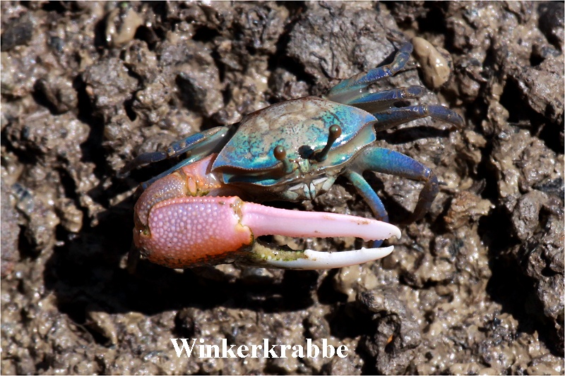 Wir konnten kleine hellblaue Krebse sowie Schlammspringer beobachten. Nach ca. 2 Stunden machte sich bei mir die enorme Hitze (über 30°) sowie die hohe Luftfeuchtigkeit bemerkbar. Unsere Wasservorräte schrumpften schneller als uns lieb war. Mit den letzten Tropfen erreichten wir schließlich ziemlich erschöpft unseren Ausgangspunkt. |