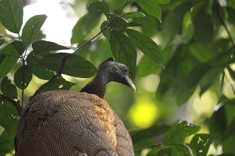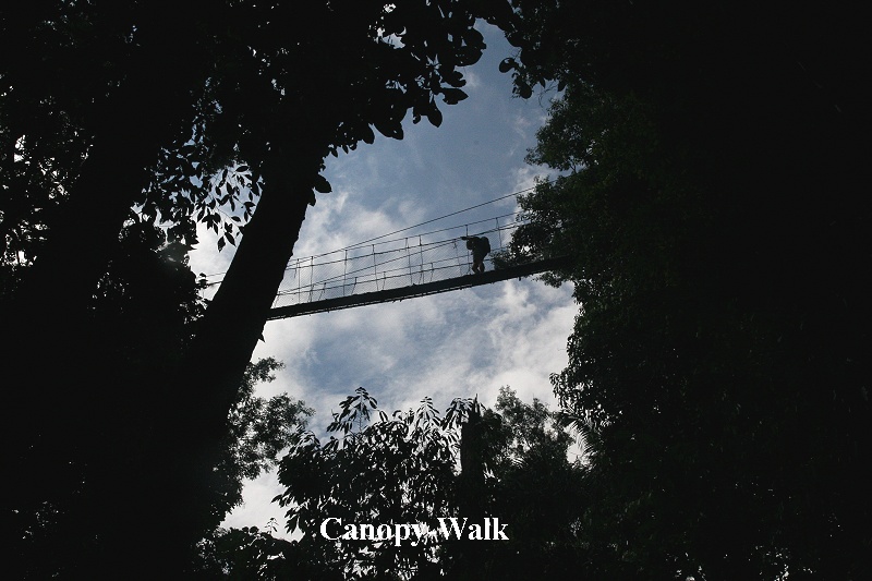 Dann ging es weiter 1,5 km östlich zum Canopy-Trail, einem 400m langen Hängebrückenweg in ca. 30m Höhe, der einzelne Urwaldriesen miteinander verbindet. Da Tomoko nicht schwindelfrei ist und auch ich keine große Lust für ein Kletterabenteuer in luftiger Höhe verspürte, gingen wir weiter. Jetzt ging es sehr steil bergauf über glitschige Baumwurzeln nach Norden. Teilweise waren Halteseile gespannt, an denen man sich hochziehen konnte. Der Schweiß lief in Strömen. Von Ferne hörten wir immer wieder den markanten Ruf des Argusfasans (Great Argus) durch den Dschungel schallen. Wir kletterten langsam weiter hoch, hörten aber längere Zeit nichts mehr vom Argusfasan. Wir konnten mehrere Schamadrosseln (White-rumped Shama) beobachten, die wunderschön sangen. Nach einer weiteren Stunde anstrengender Kletterei erreichten wir eine Abzweigung und es ging leicht bergab in westlicher Richtung. |