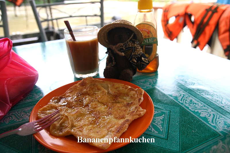 Um 7:00 h war Tomoko schon wach. Ich schlief noch eine halbe Stunde länger. Heute frühstückten wir getrennt. Tomoko und Bärchen wollten unbedingt einen Bananenpfannkuchen am Fluss essen. Also fuhr ich die beiden kurz dorthin, während ich anschließend im Hotel frühstückte. |