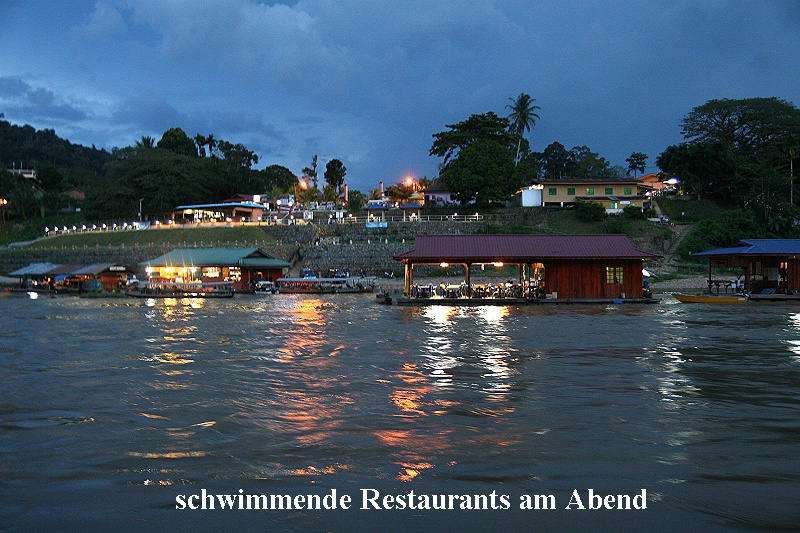 Ich aß ein leckeres Chicken-Curry, Tomoko einen "Tofu-Claypot", beides mit Reis und sehr lecker. Wir fuhren nochmals mit dem Wassertaxi auf die gegenüberliegende Seite und reservierten eine Bootsfahrt am anderen Morgen auf dem Tahan-River. Es wurde dunkel und am Himmel zuckten wieder Blitze, die aber diesmal weit weg blieben. In unserer jetzt wieder angenehm kühlen Junior-Suite angekommen duschten wir, tranken ein Bier auf der Terrasse und schrieben noch etwas Tagebuch. Nach der unruhigen vorhergehenden Nacht gingen wir dann früh um 21:45 h schlafen. |