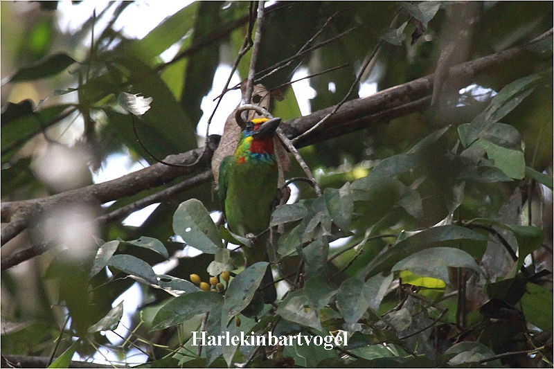 Nicht ganz ausgeschlafen wurden wir gegen 7:15 h wach, duschten und gingen zum Frühstück. Strom war immer noch nicht da, trotzdem gab es Omelette, Kaffee und weiches Toastbrot. Um 9:00 h waren wir auf der anderen Seite des Flusses und machten uns auf den Weg, den uns Keith am Abend vorher skizziert hatte. Wir wanderten zwischen den Bungalows des Mutiara-Resorts nach Osten. Hier konnten wir einen Rosenkopf-Breitrachen (Banded Broadbill) sehen. |