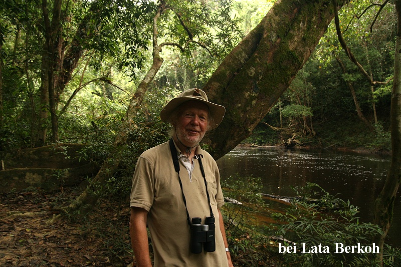 Es war noch angenehm kühl. Hin und wieder passierten wir Stromschnellen, über die unser Kapitän geschickt hinweg manövrierte. Auf der Spitze des Bootes saß ein weiterer Malaie, der mit einem Paddel half, den Kurs zu halten. Wir fuhren etwa 10 km stromauf bis zu einer Stelle, wo dicke Felsen im Fluss ein Weiterfahren unmöglich machten. Auf der Fahrt hierher sahen wir mehrere Hornbills in großer Höhe (40-50m) die Baumwipfel kreuzen. Wir konnten leider nicht bestimmen, um welche Art es sich handelte. |