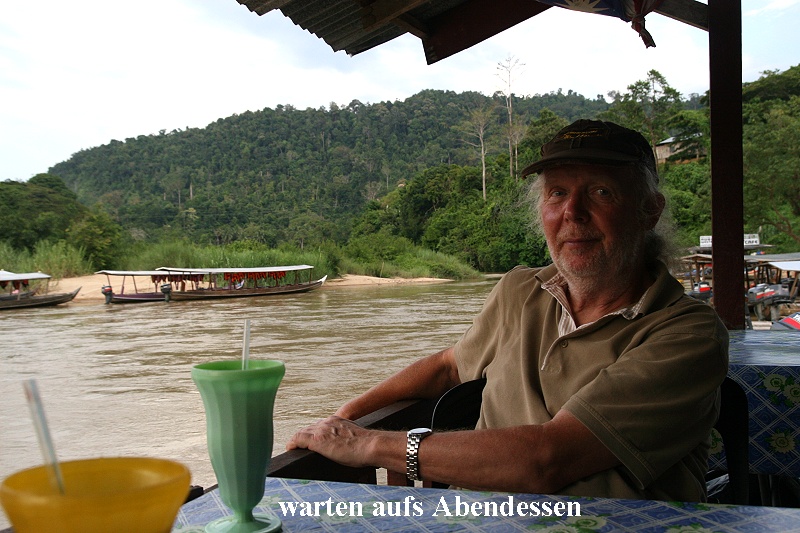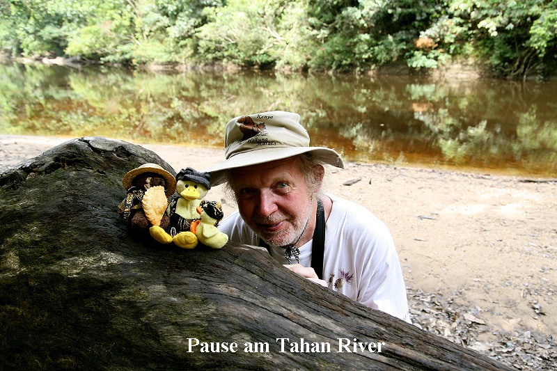 Es gab einen leckeren Bananenpfannkuchen mit Kaffee. Pünktlich um 8:00 h kam unser Boot. Wir machten es uns bequem und langsam ging es den Tahan-Fluss stromauf. Es lag noch dichter Nebel über dem Dschungel. Der Fluss strömte träge dahin. Die fast schwarze Farbe des Flusses, dazu die Stimmen und Geräusche aus dem Dschungel, schufen eine gespenstische Atmosphäre. |