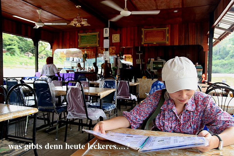 Wir stiegen aus und wanderten einen Trail 700m bis zu einer Hütte, die sich "Fishing Lodge Lata Berkoh" nennt. Nach ca. einer Stunde kamen wir wieder beim Boot an, wo wir schon von unseren beiden Kapitänen erwartet wurden. In langsamer Fahrt ging es wieder zurück, an vielen Stellen einfach ohne Motorkraft auf dem schmalen Fluss treibend. Auf der Rückfahrt kamen uns so nach und nach rund 20 Boote entgegen, meistens mit einheimischen Passagieren. Es war halt Samstag, Wochenende. Gegen 11:30 h kamen wir wieder beim Mutiara-Resort an. Wir zahlten die vereinbarten 160 RM (33,50 €) und gingen noch ein wenig in die nähere Umgebung spazieren. Seit 2 Stunden brannte die Sonne wieder heiß vom Himmel. Ich hatte mir bei der Rückfahrt einen beachtlichen Sonnenbrand an beiden Knien geholt, hatte vergessen, mich mit Sonnenöl zu schützen. Wir hielten noch mal nach dem (Banded Pitta) Ausschau, leider vergeblich. Gegen 13:30 h wurde es uns zu heiß, und wir fuhren zum Hotel zurück. Das erwartete Eis blieb leider aus, da die Vorräte durch den gestrigen Stromausfall geschmolzen waren. Also planschten wir ein wenig im Pool herum und machten Siesta im kühlen Zimmer. Der Hunger trieb uns dann gegen 17:00 h wieder nach draußen. |