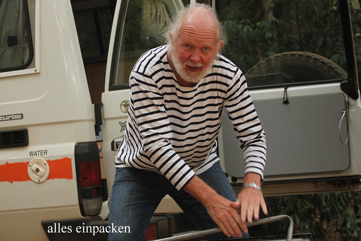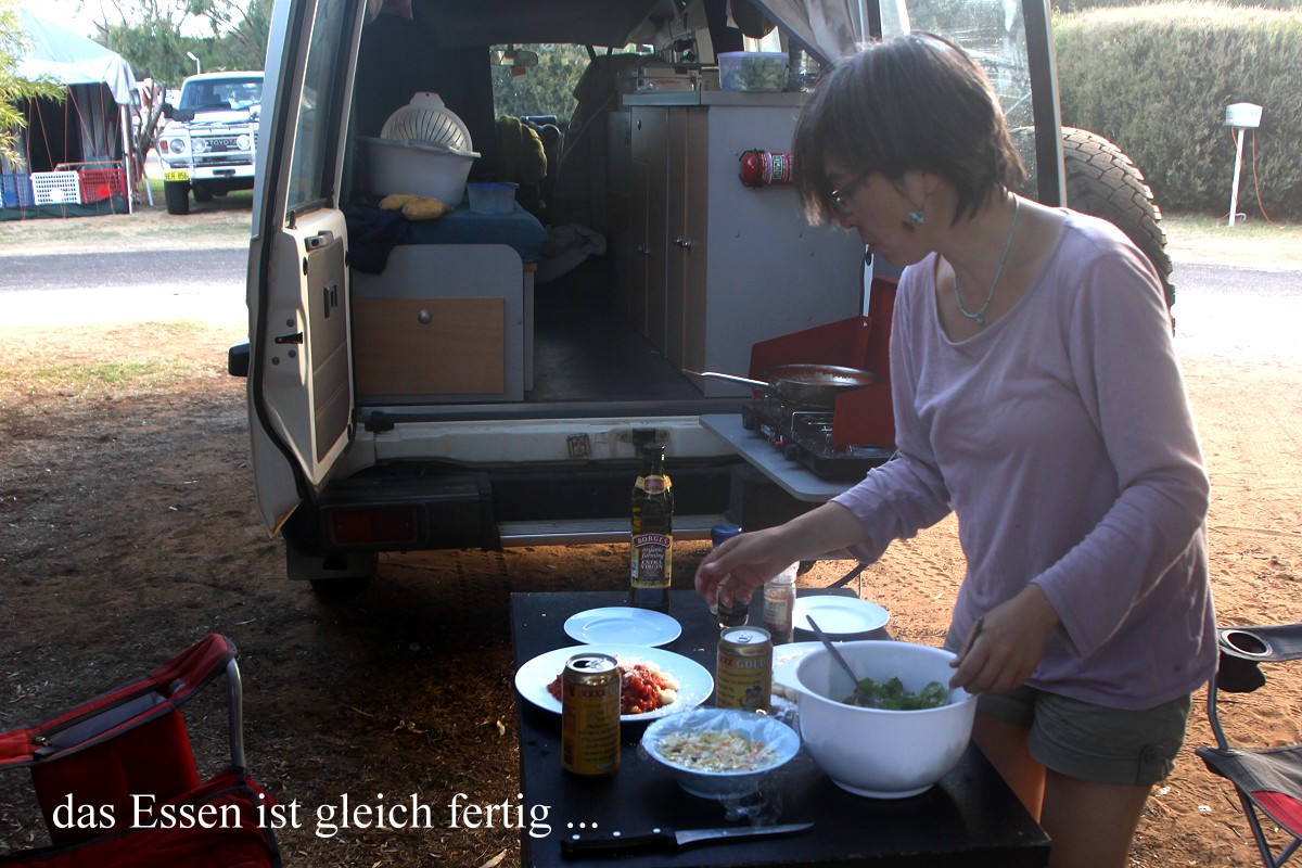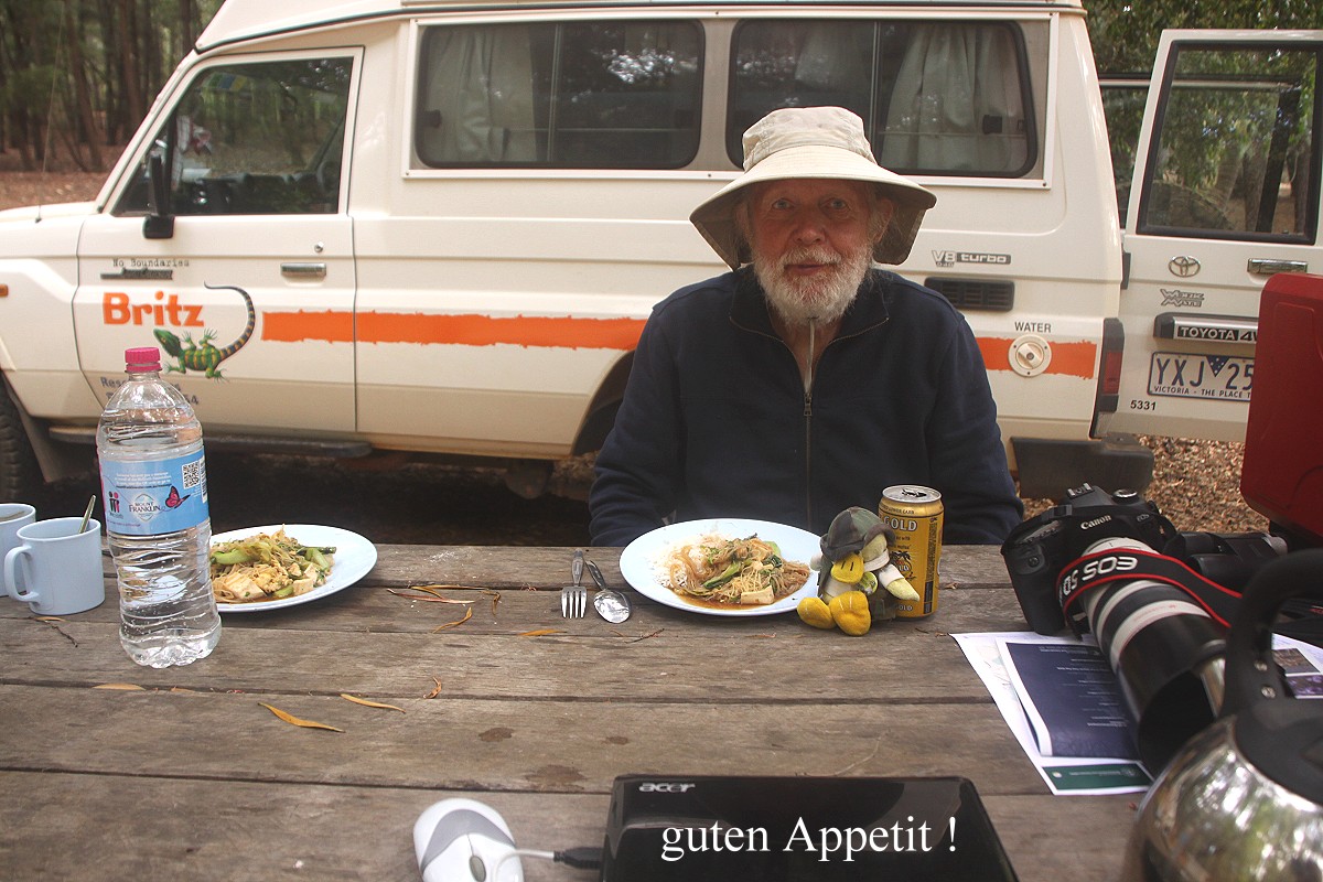 Nun wurde es langsam Zeit fürs Abendessen. Heute kochten Entelchen (Chefkoch) und Tomoko Gemüse mit Bush Lemon Myrtle Curry (ein typisch australisches Gewürz ) in Kokusnussmilch mit Reis, sehr lecker… Das dazugehörige Bier versteckte Entelchen in einer Serviette, da wir am Eingang des Campingplatzes gelesen hatten, dass alkoholische Getränke verboten sind, merkwürdig… Ein Kookaburra flog heran und setzte sich in der Nähe auf einen Ast. |