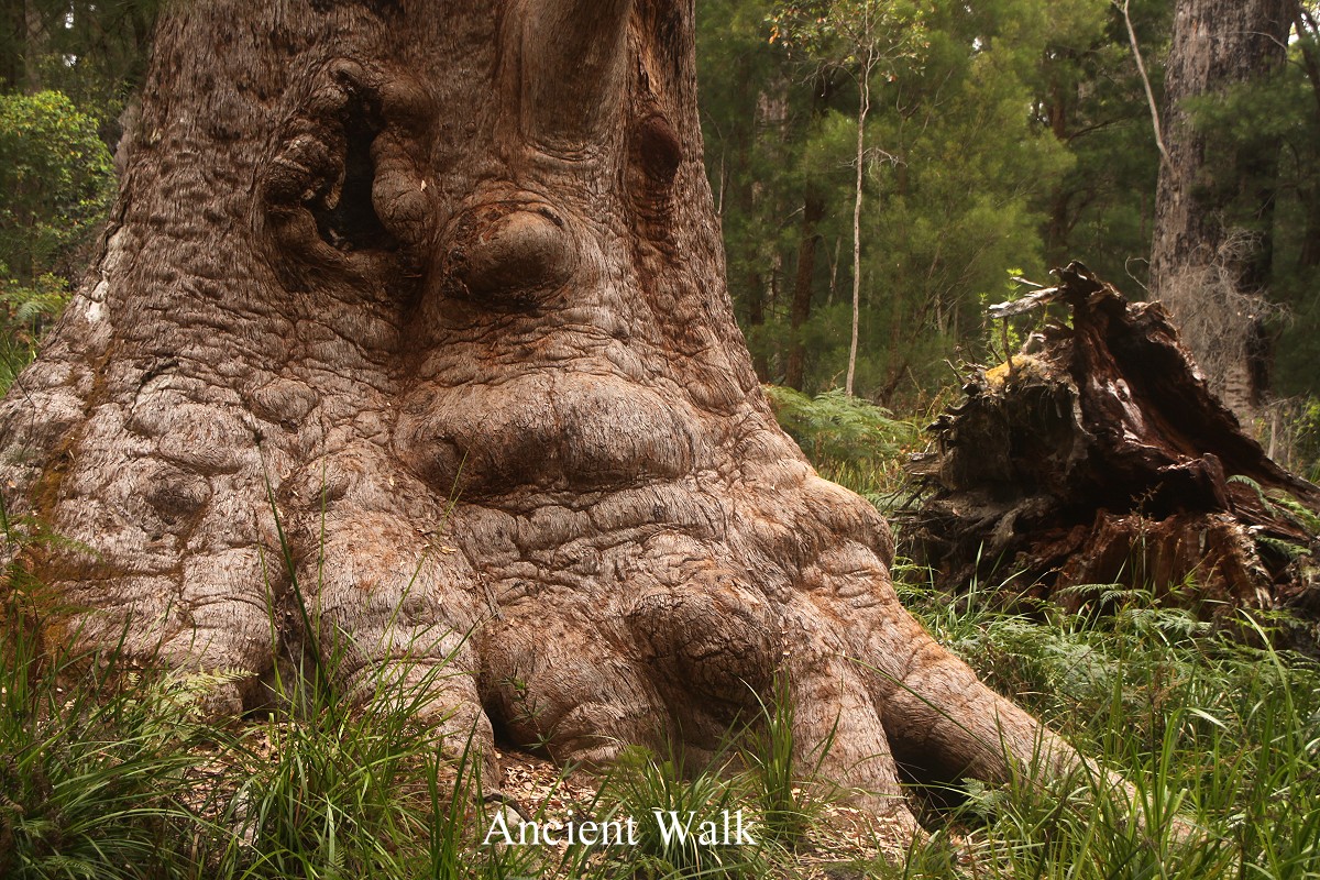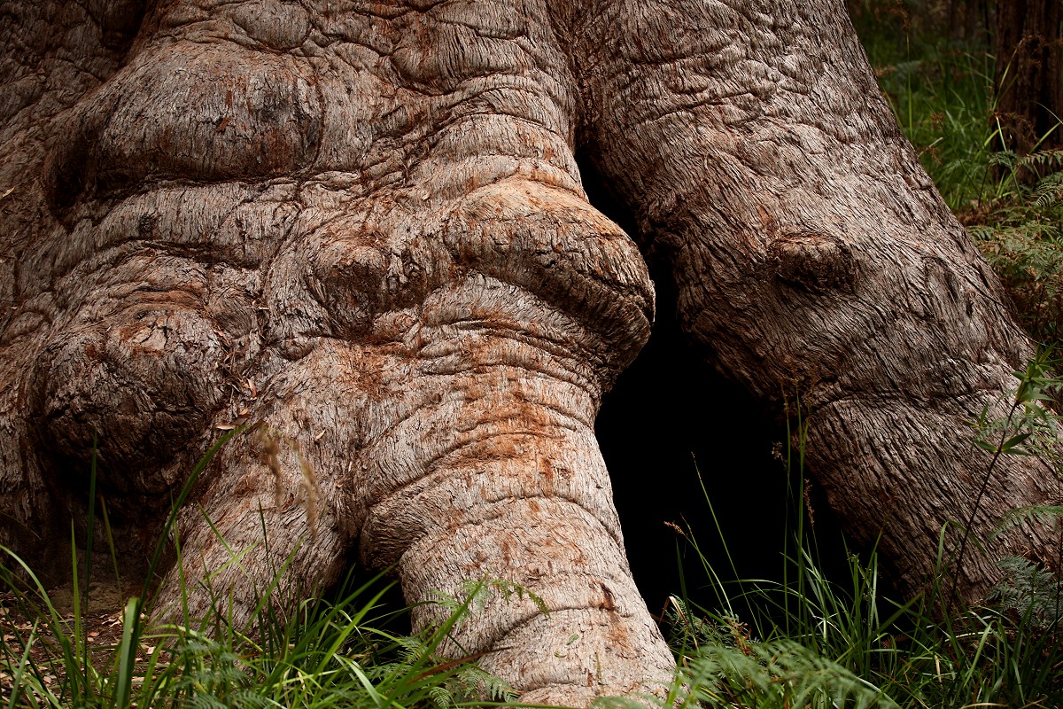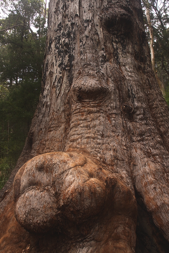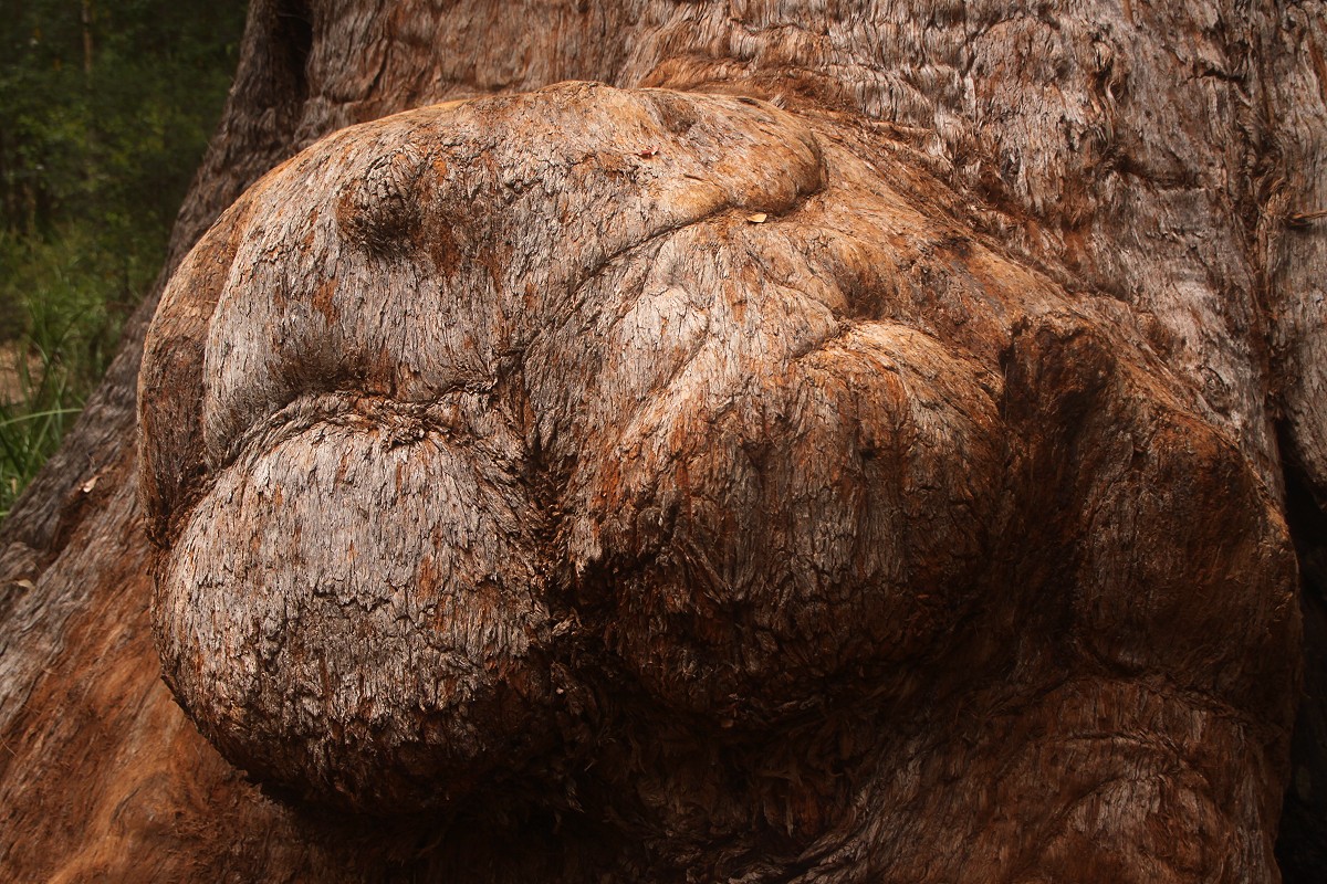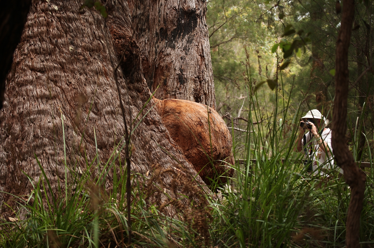 Zudem sahen wir noch White-browed Scrubwren, Grey Fantail und 2 Black Cockatoos hoch über uns fliegend. Aus der Ferne schallte das Lachen eines Kookaburras zu uns herüber. An einigen Bäumen waren gewaltige knorrige Verwachsungen zu sehen. Wie wir einer Infotafel entnehmen konnten, sind diese Verwachsungen die Folge von Schutzmaßnahmen, die die Bäume gegen Verletzungen in jungen Jahren entwickelt haben. Einige Bäume hatten große Öffnungen unten im Stamm, durch die man hindurchgehen konnte. |