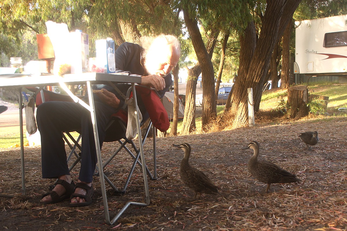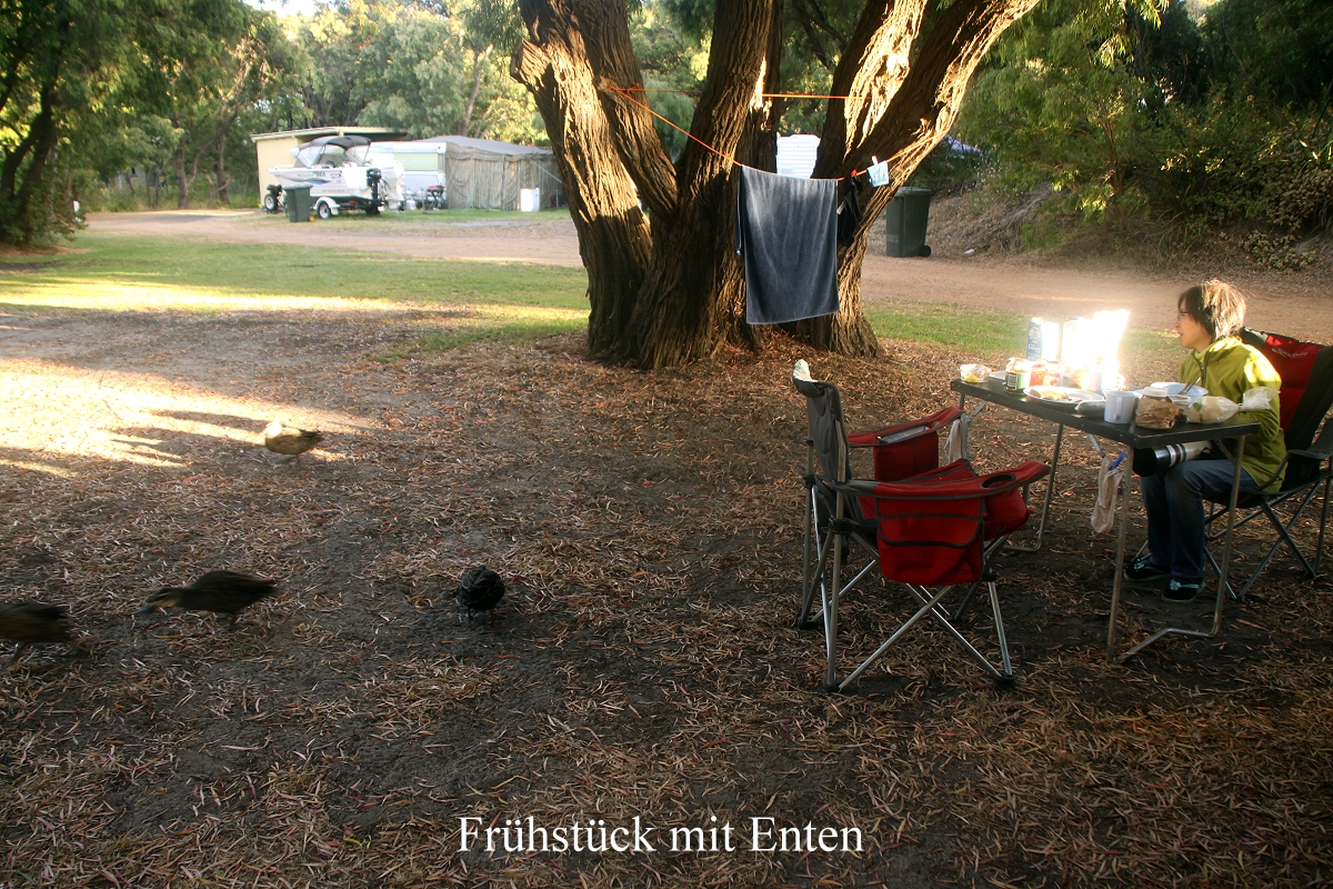 Um 5.30 h wurden wir wach und standen auch gleich auf. Es war sehr bewölkt, zwischen einigen Wolkenlücken schimmerte das Licht der aufgehenden Sonne durch. Wir bereiteten das Frühstück vor und sofort näherten sich wieder 2 Enten, deren Schar sich im Verlauf des Frühstücks auf 6 vergrößerte. Eine von ihnen, offensichtlich die von gestern Abend, ging immer wieder aggressiv auf ihre Artgenossen los und versuchte sie zu verscheuchen, was ihr aber nicht gelang. Auch die kleinen Brillenvögelchen (Silvereyes) und einige Tauben (Common Bronzewing) kamen wieder zu uns. |