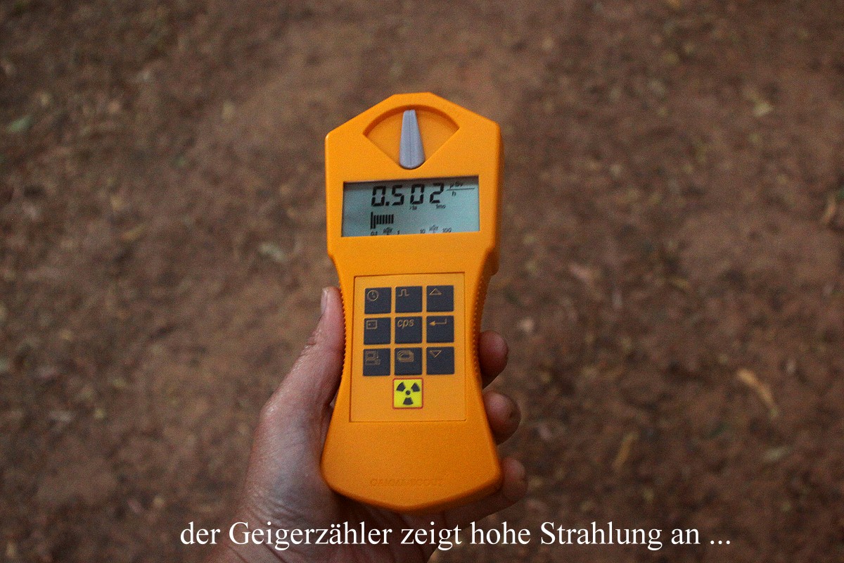 Unter den hohen Bäumen wurde es früh ziemlich kühl, so dass ich meine warme Jacke zum Abendessen anzog. Das Essen schmeckte zusammen mit einem Bier (Entelchen und ich) vorzüglich. Als ich anschließend spülte, suchte Tomoko mit unserem Geigerzähler die nahe Umgebung nach radioaktiver Strahlung ab. Was sie herausfand war ziemlich schockierend. An unserem Platz war die Strahlung mit ca. 0,2 MikroSievert / Std. noch einigermaßen tolerabel, das ganze Gelände hatte Werte von 0,3 - 0,4, aber auf dem Fahrweg, der mit einer Kiesschicht bedeckt war, maß Tomoko stolze 0,7, ein viel zu hoher Wert… !!! |