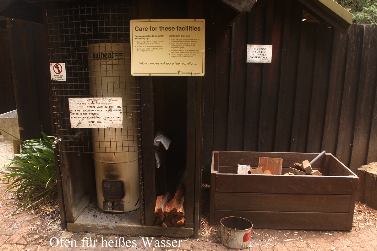 Um 16.20 h waren wir von unserem Spaziergang zurück. Ich spülte schnell, von Äffchen unterstützt, das Geschirr vom Nachmittagskaffee und begann Tagebuch zu schreiben. Tomoko kochte derweil das Abendessen, heute wieder chinesisch, Reis mit Pakchoi, Broccoli, Tofu und Glasnudeln. Wir schauten zwischendurch mal bei den Waschräumen und Toiletten vorbei. Es gab hier die Möglichkeit, heiß zu duschen. Dazu musste man aber wie zu Großmutters Zeiten unter einem Wasserboiler ein Holzfeuer entzünden und warten bis das Wasser warm wird. Holz dazu lag bereit. Das war zwar sehr interessant anzuschauen, aber es erschien uns ein wenig zu umständlich, so dass wir heute auf eine warme Dusche verzichteten. |