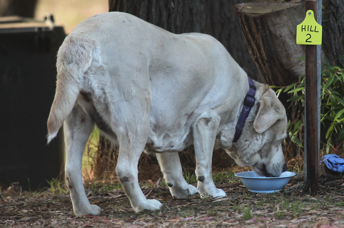 Ein Campingplatzbewohner, der mit seinem Hund vorbeiging, sagte uns, dass 20 m neben uns in einem kleinen Busch sich eine schwarze Schlange aufhielte, eine Black Tiger Snake, eine der giftigsten Schlangen weltweit. Ich nahm sofort meine Kamera in die Hand und ging zu der Stelle, blieb aber in achtungsvollem Abstand. Intensiv versuchte ich in dem dichten Gras die Schlange zu entdecken, doch sie hatte sich offensichtlich bestens versteckt, so dass ich sie nicht sah, schade… Stattdessen näherte sich ein gemütlicher dicker Hund, der zunächst aus unserer für die Vögel bestimmten Wasserschale trank und sich dann neben Tomoko auf den sandigen Boden legte und sich behaglich ausstreckte, als Tomoko ihn zu kratzen begann. |