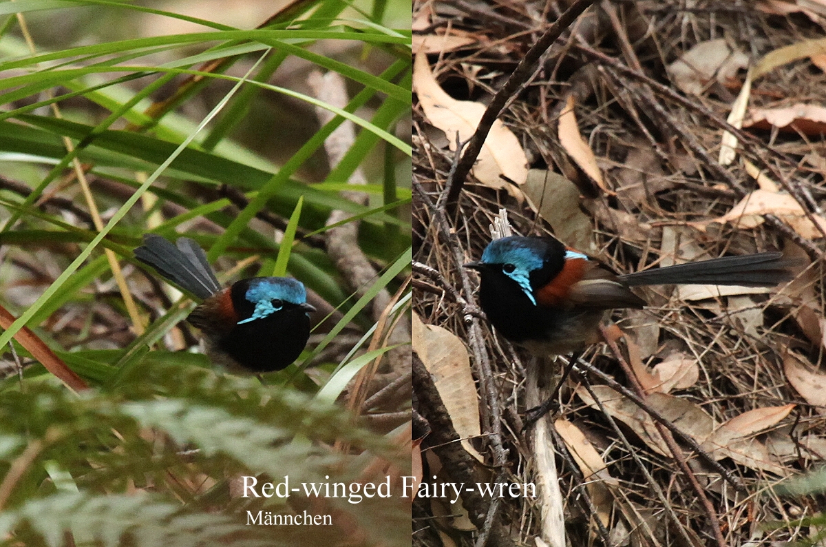 Dafür sah ich aber, wie eine ganze Familie Red-winged Fairy-Wrens durch die Zweige hastete. Einmal kam ein Jungvogel, sich noch unsicher in der Luft haltend, direkt auf mich zu und streifte dabei fast meinen Hut. Ein Western Rosella, gar nicht scheu, kletterte durch die dichten Zweige eines kleinen Busches direkt über unseren Köpfen. |