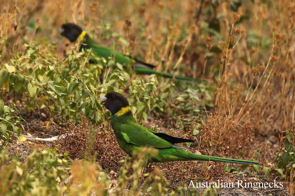 Gegen 11.00 h waren wir wieder am Eingang zurück. Im Souvenir-Shop kaufte ich für Tomoko eine schöne grüne Tasche und ein hübsches Portemonnaie nachträglich zu ihrem Geburtstag, worüber sie sich sehr freute. Inzwischen waren etliche Besucher angekommen, gut dass wir so früh hier waren. Nach ein paar km erreichten wir die Ortschaft Walpole. Hier kauften wir Kuchen für den Nachmittagskaffee. Nun machten wir uns auf die Suche nach einer Bleibe für die Nacht. Einige km hinter Walpole zweigt eine Straße zum Mandalay Beach ab, wohin ich gerne gefahren wäre. Als wir aber auf einer Hinweistafel lasen, dass der Campingplatz dort in der Nähe nur über ein Stück tiefer Sandpiste zu erreichen ist, verzichteten wir lieber darauf. Es wurde empfohlen, wie immer auf solchen 4WD-Pisten, den Reifendruck zu reduzieren, aber die Gefahr, trotzdem irgendwo steckenzubleiben trotz Vierradantriebs, erschien uns zu groß. Wir fuhren also weiter den Highway Nr.1 Richtung Manjimup. Um 12.40 h wurde ich plötzlich sehr müde, so dass wir an den Straßenrand fuhren und eine kleine Pause machten, allerdings nur 10 min, da ich erstaunlicherweise sehr schnell wieder wach wurde und mich frisch fühlte. Tomoko schlief noch ein wenig weiter, während ich wieder losfuhr. Um 13.15 h erreichten wir Shannon, einen Campingplatz inmitten des gleichnamigen Nationalparks. Als wir abbogen entdeckten wir im Gras neben der Straße eine große Gruppe Papageien (Western Ringnecks), so an die 15 Exemplare. Auch zwei farbenprächtige Western Rosellas waren darunter. |