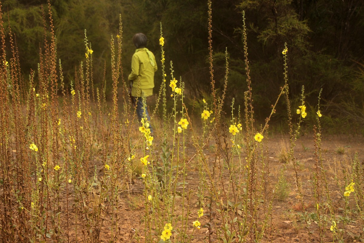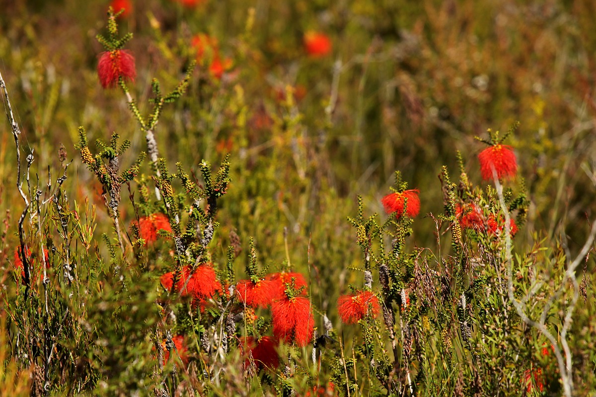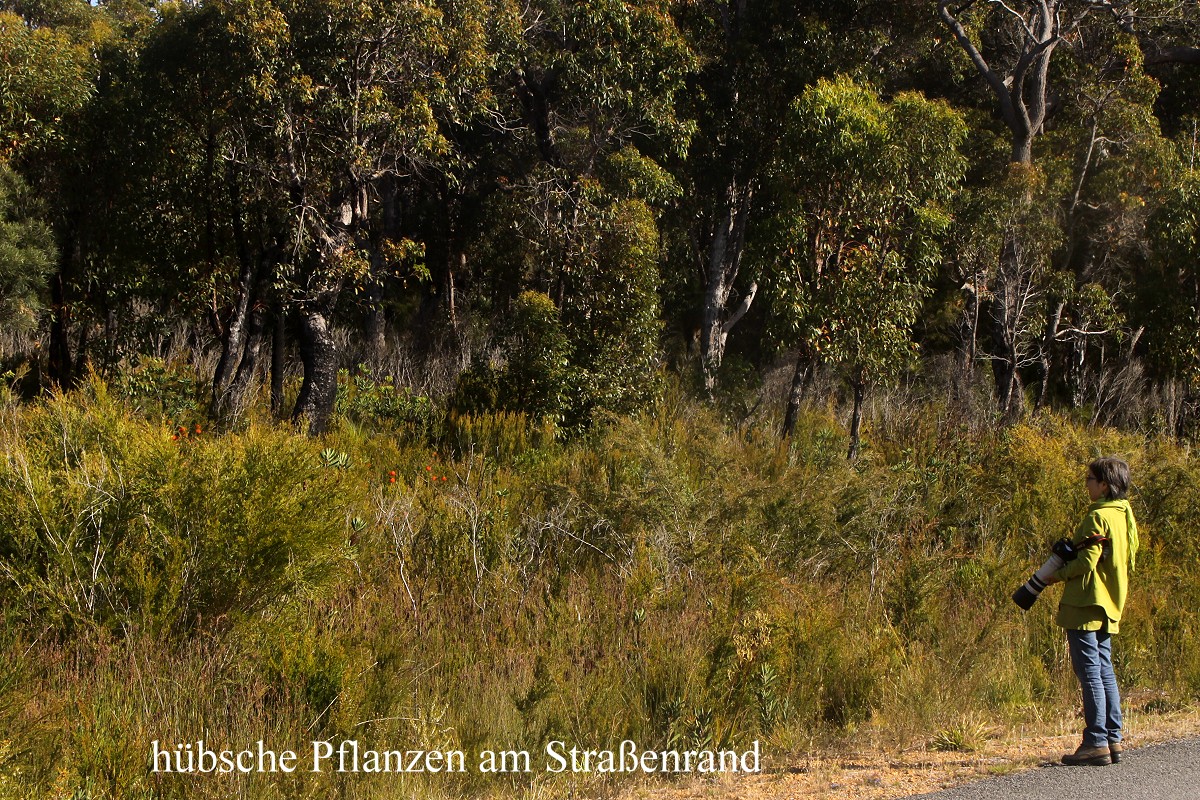 Es war nur 16°. Ich machte noch schnell ein Foto an der Stelle, wo vor 50 Jahren noch eine Siedlung gestanden hatte. Auch kurz vor der Einmündung in den Highway stiegen wir noch mal kurz aus. Etliche schöne Blumen wuchsen dort. Einige Papageien (Western Ringnecks) , sowie eine ganze Familie Splendid Fairy-wrens waren auch wieder da. |
