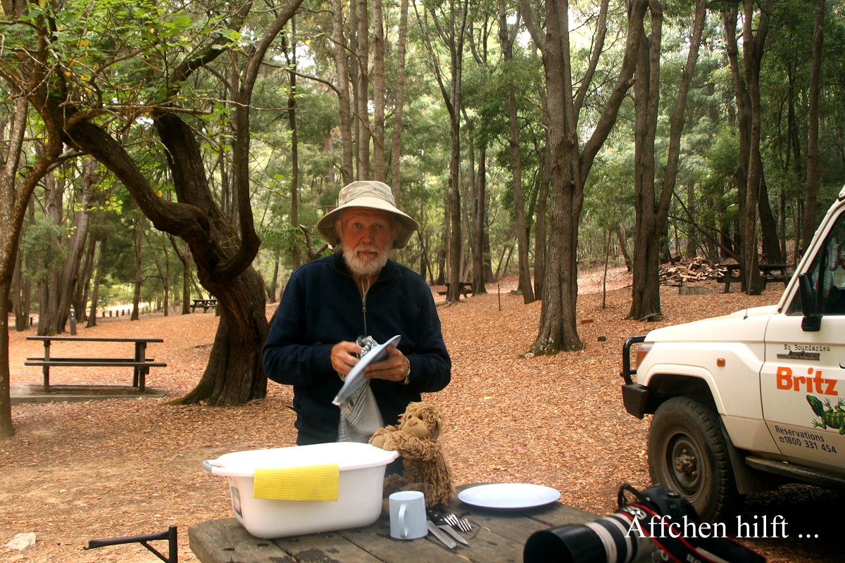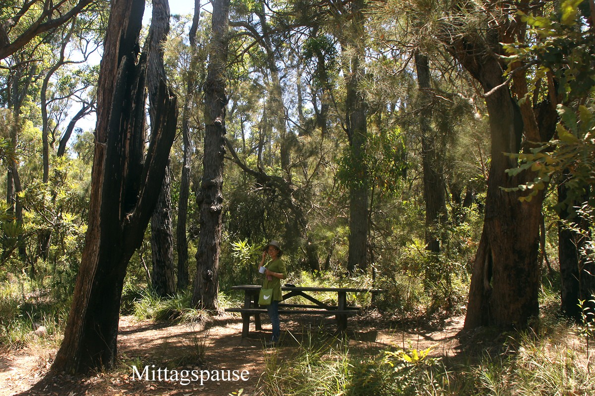 Um 10.50 h fuhren wir weiter. Bis Augusta waren es noch 125 km. Den größten Teil der Strecke fuhren wir durch dichte Karri-Wälder, die teilweise vor Jahren mal abgebrannt waren und wieder neues Grün gebildet hatten. Gegen 11.30 h, ca. 65 km vor Augusta, war die Temperatur inzwischen auf angenehme 27° gestiegen. Um 11.55 h erreichten wir die Straße, die Nannup mit Augusta verbindet. Hier fanden wir auch gleich den auf unserer Karte eingezeichneten Picknickplatz (von Tomoko entdeckt) mit Tischen, Sitzbänken und Toilette, auf dem wir eine Pause machten. Wir ließen uns die Reste des gestrigen Abendessens schmecken. |