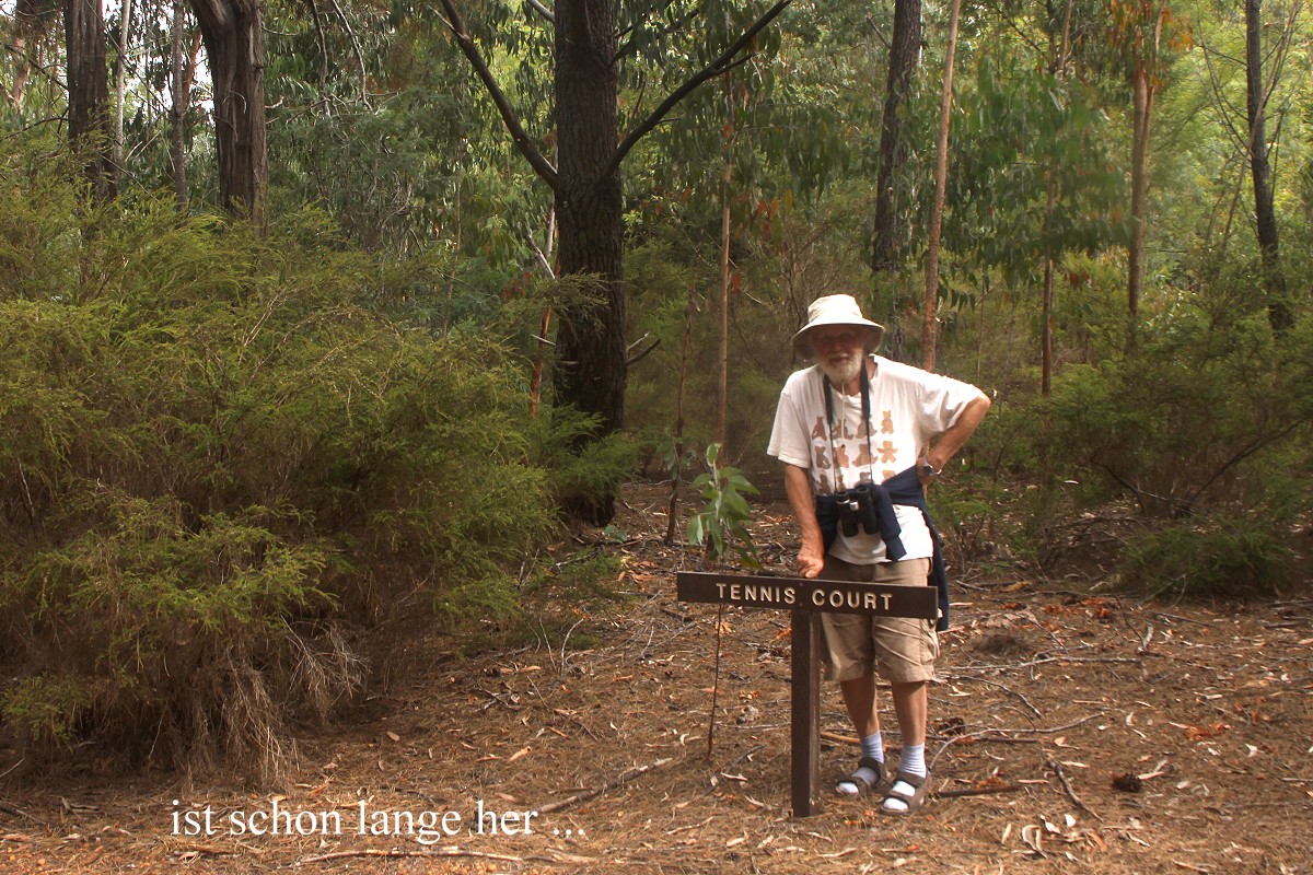 Um 13.45 h erreichten wir nach einigen hundert Metern den Campingplatz, der wunderschön inmitten des Waldes unter dichten hohen Bäumen liegt. Nachdem wir uns registriert hatten (9,- $ pro Person), das Geld in einen Umschlag gesteckt und in eine eiserne Box geworfen hatten, suchten wir uns einen einsamen Platz aus, der nur für kleinere Fahrzeuge wie das unsrige erreichbar ist. Gleich neben unserem Stellplatz hatten wir einen stabilen Holztisch mit 2 Bänken, wo wir zunächst mal Kaffee kochten und unseren mitgebrachten Kuchen aßen. Anschließend um 15.10 h brachen wir zu einem Spaziergang in die nähere Umgebung auf. Ein schmaler Fußweg führte mitten durch den lichten Wald. Als wir ihm folgten trafen wir auf einige merkwürdige Schilder "Post Office", "General Store", "Tennis Court", inmitten der Bäume. Wie wir später erfuhren, wurde hier mal in den 40-er Jahren eine kleine Siedlung gegründet, wo Arbeiter wohnten, die in der Holzindustrie arbeiteten, als der Holzbedarf nach dem 2.Weltkrieg stieg. Die Siedlung bestand aus rund 90 Gebäuden, wurde aber 1968 wieder abgerissen. Heute liegt der Campingplatz auf diesem Gelände und alles ist von schnellwachsenden jungen Bäumen und Gebüsch überwuchert. Wir wanderten langsam weiter. Einige Kängurus hüpften vor uns davon. Ein Kookaburra lachte wieder laut. Einige kleine Fairy-Wrens waren auf Futtersuche und einige Black-Cockatoos flogen über uns hinweg. Tomoko entdeckte auch einen Western Yellow Robin, leider waren die Fotos nicht scharf. |