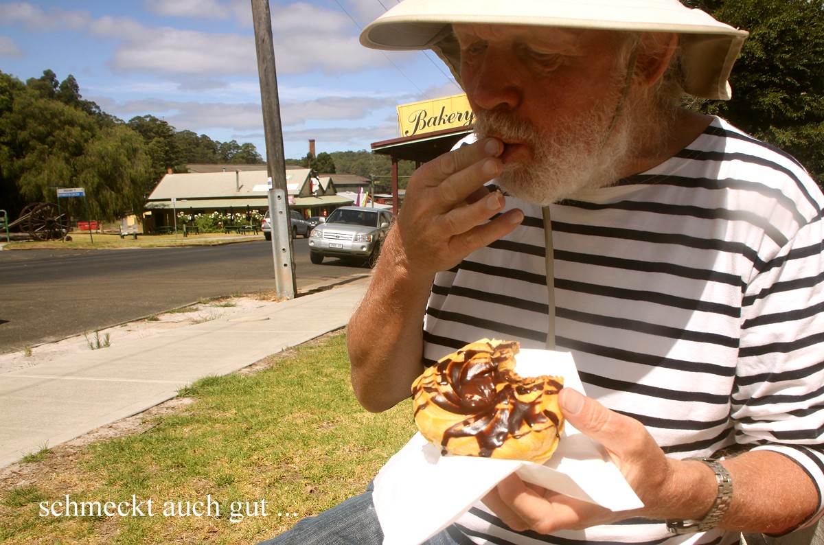 Inzwischen wurde es deutlich wärmer (24°), der Himmel bekam wesentlich mehr große blaue Stellen und die Wolken wurden immer kleiner. Um 10.30 h erreichten wir Pemberton, neben Northcliff die einzige Ortschaft auf dem 200 km langen Weg nach Augusta. An einer Bäckerei hielten wir an. Tomoko ging hinein und kaufte ein leckeres Stück Kuchen und einen Cappuccino. Beides teilten wir draußen auf einer Bank sitzend. Das schmeckte so gut, dass ich noch ein zweites Stück Kuchen kaufte. |