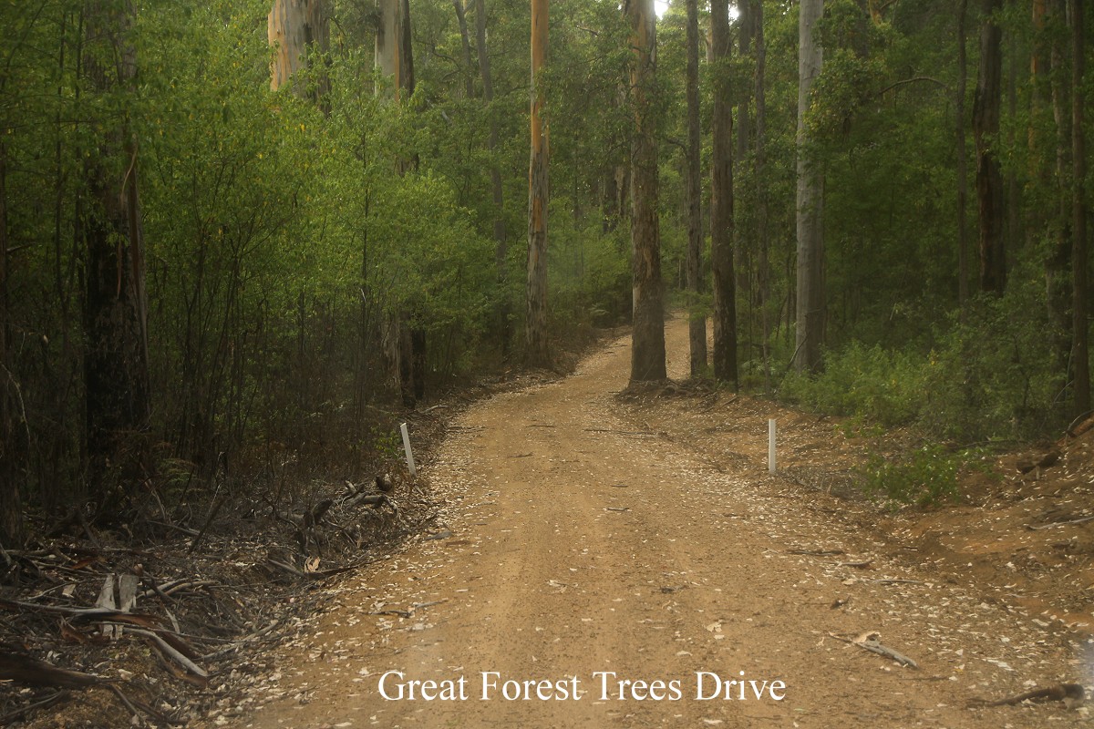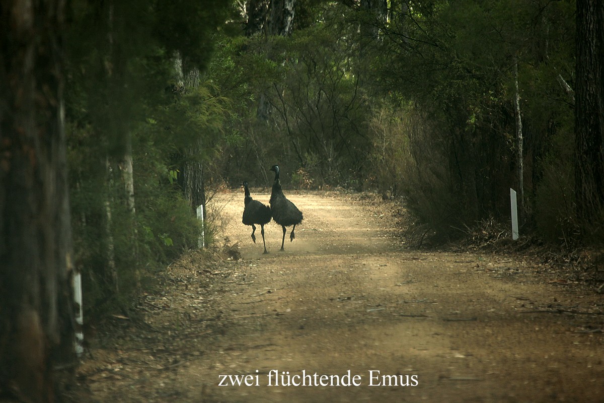 Nun aber endlich los. Zunächst fuhren wir auf einen 23 km langen unbefestigten Rundweg, der den stolzen Namen "Great Forest Trees Drive" trägt. Dieser führt als Einbahnstraße durch den dichten Wald, weshalb der aber solch einen vielversprechenden Namen hat, blieb uns schleierhaft. Offensichtlich wollte man um jeden Preis etwas Besonderes für Touristen bieten. Die Wälder die wir unmittelbar nachher durchfuhren, waren mindestens genauso eindrucksvoll, wenn nicht sogar schöner. Immerhin sahen wir gegen 8.30 h wenigstens 2 Emus, die auf der Straße vor uns flüchteten, sowie etwas später 2 Kängurus. |